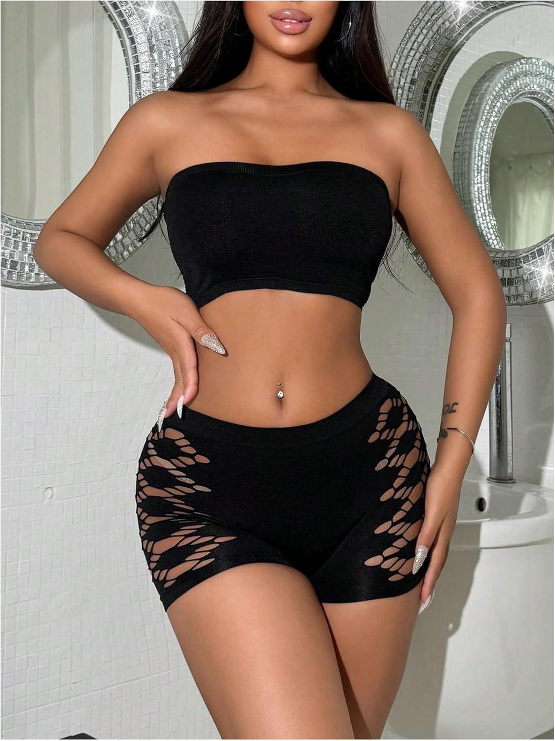 SOLY HUX Women’s 2 Piece Lingerie Set Hollow Out Wireless Bandeau Bra and Boyshorts Set Plain Black Small