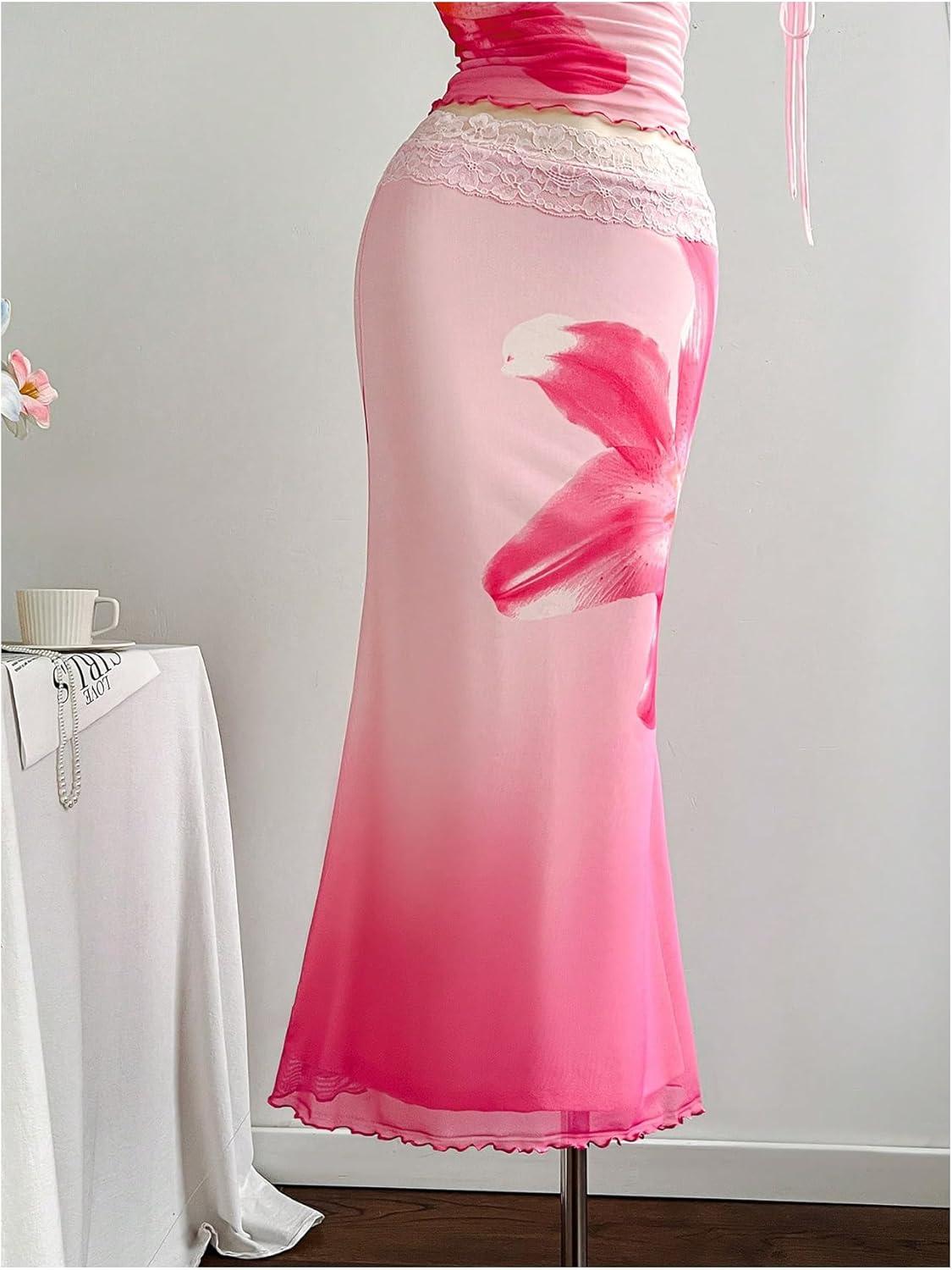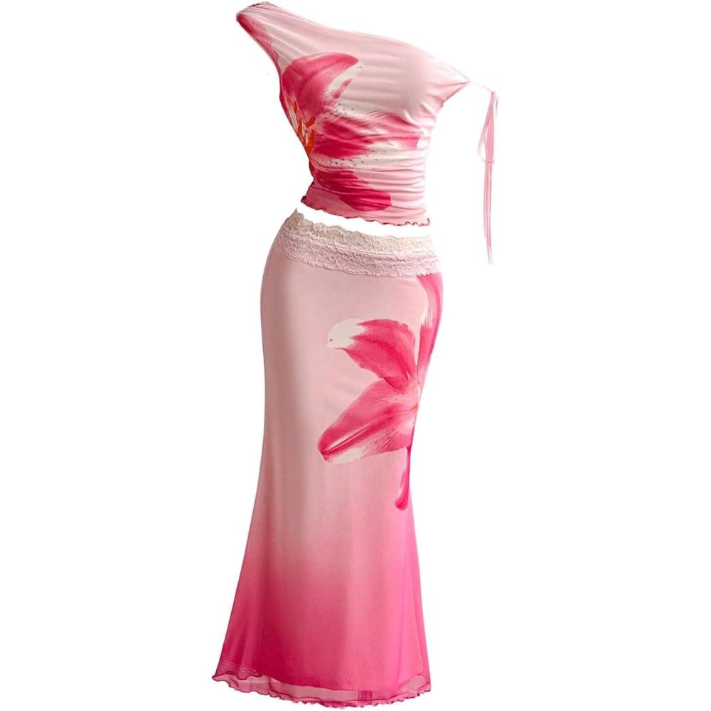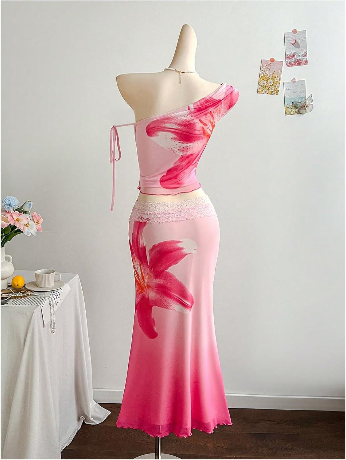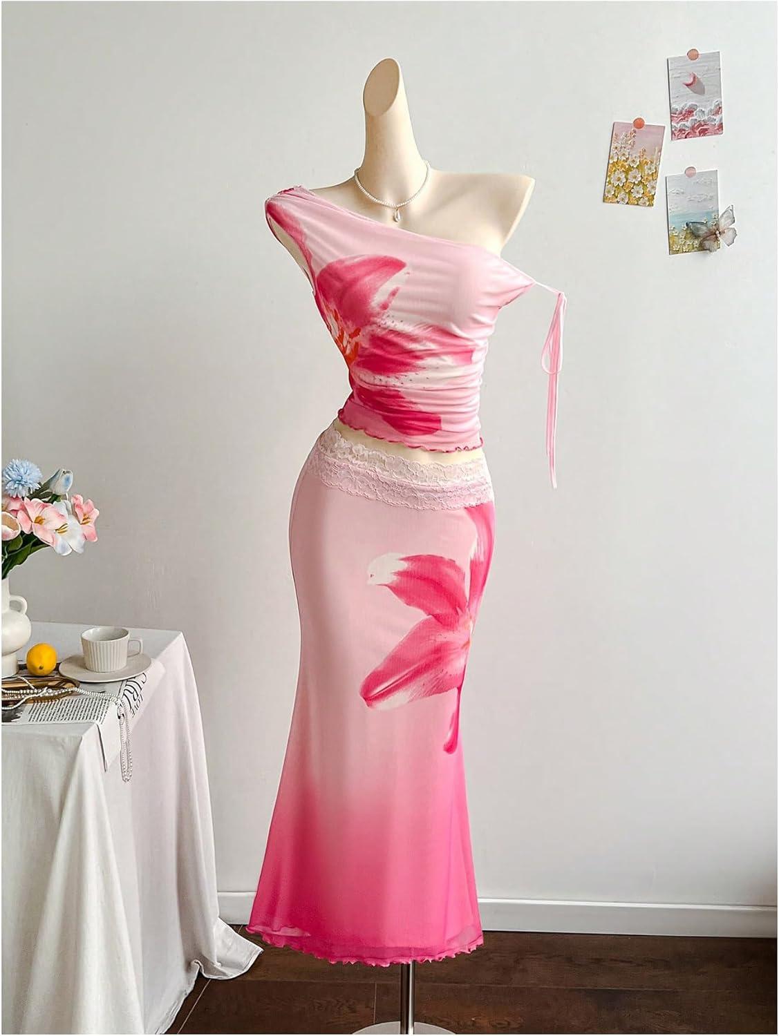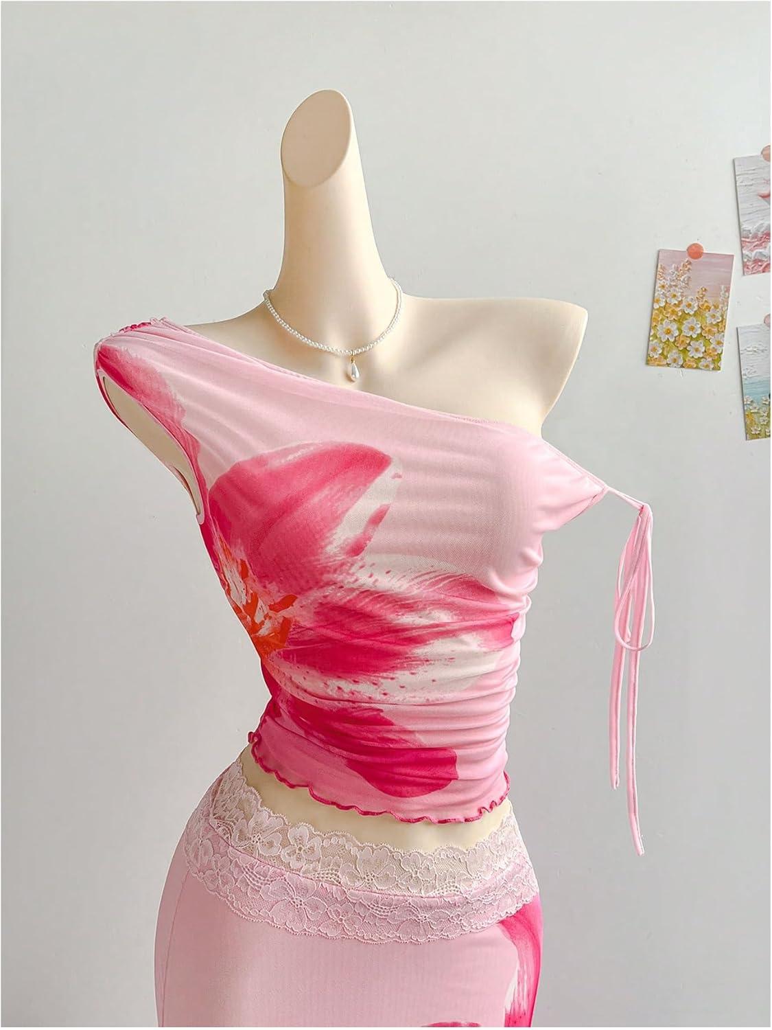 SOLY HUX Women’s 2 Piece Outfit Floral Mesh Ruched One Shoulder Crop Tank Top and Bodycon Maxi Skirt Set(Pink Floral)