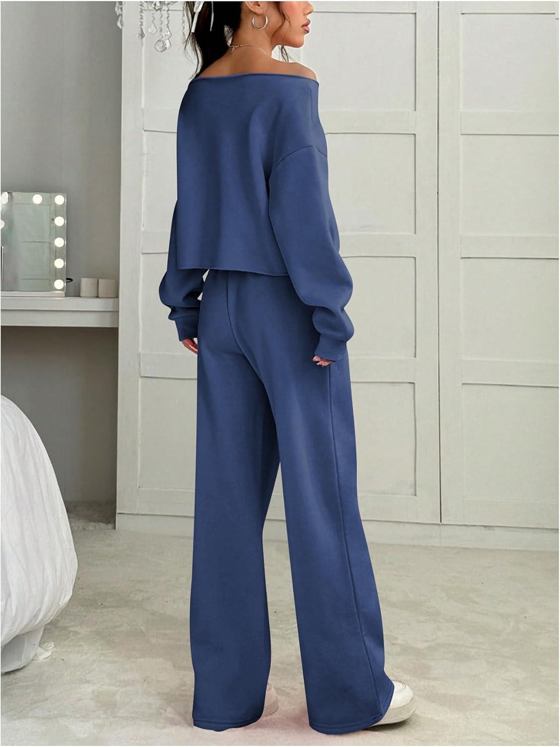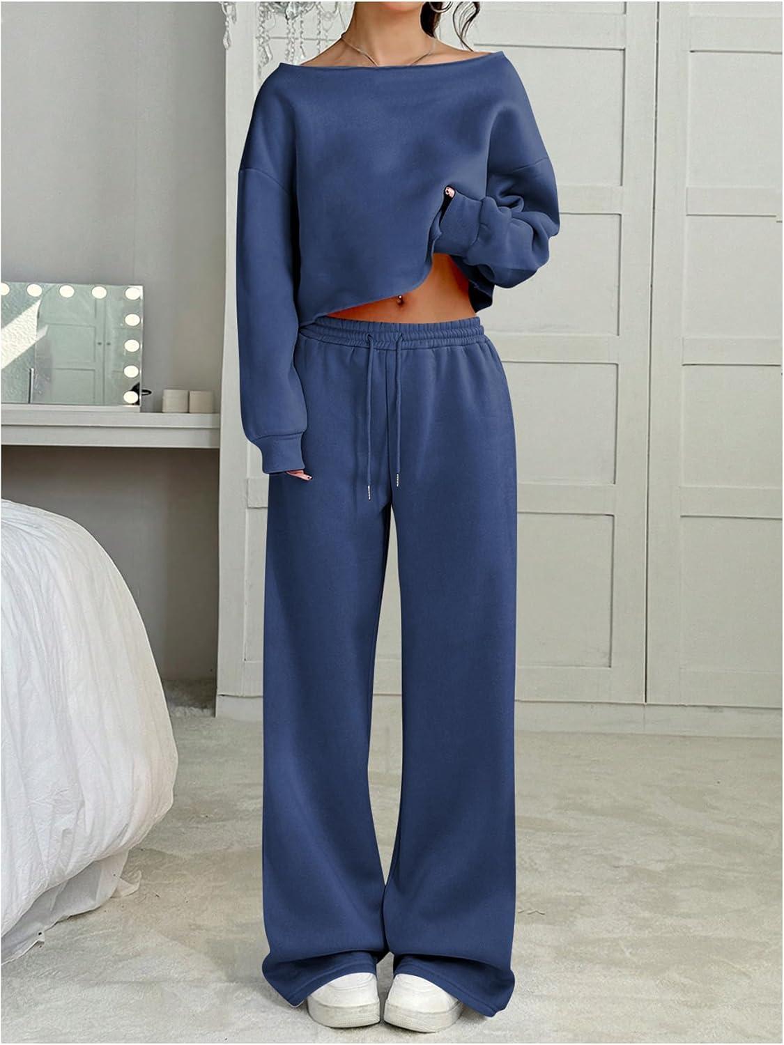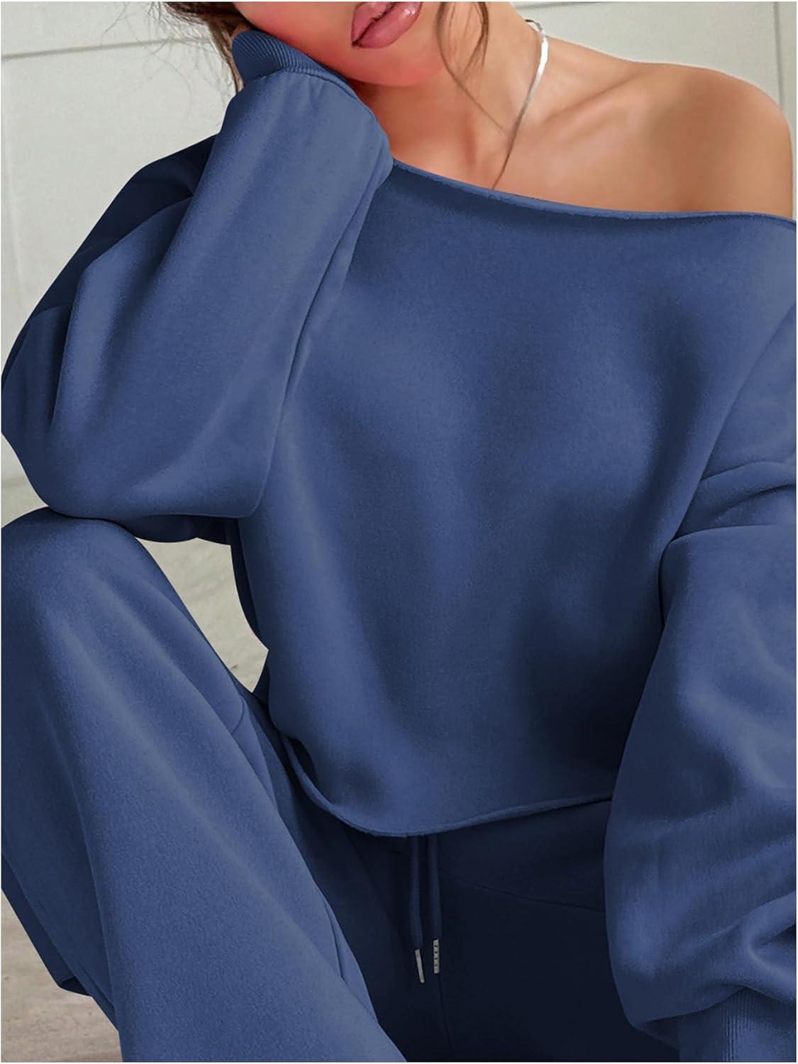 SOLY HUX Women’s 2 Piece Outfits Fall Sweatsuits Off The Shoulder Crop Top Wide Leg Sweatpants Casual Matching Lounge Sets(Pure Blue)