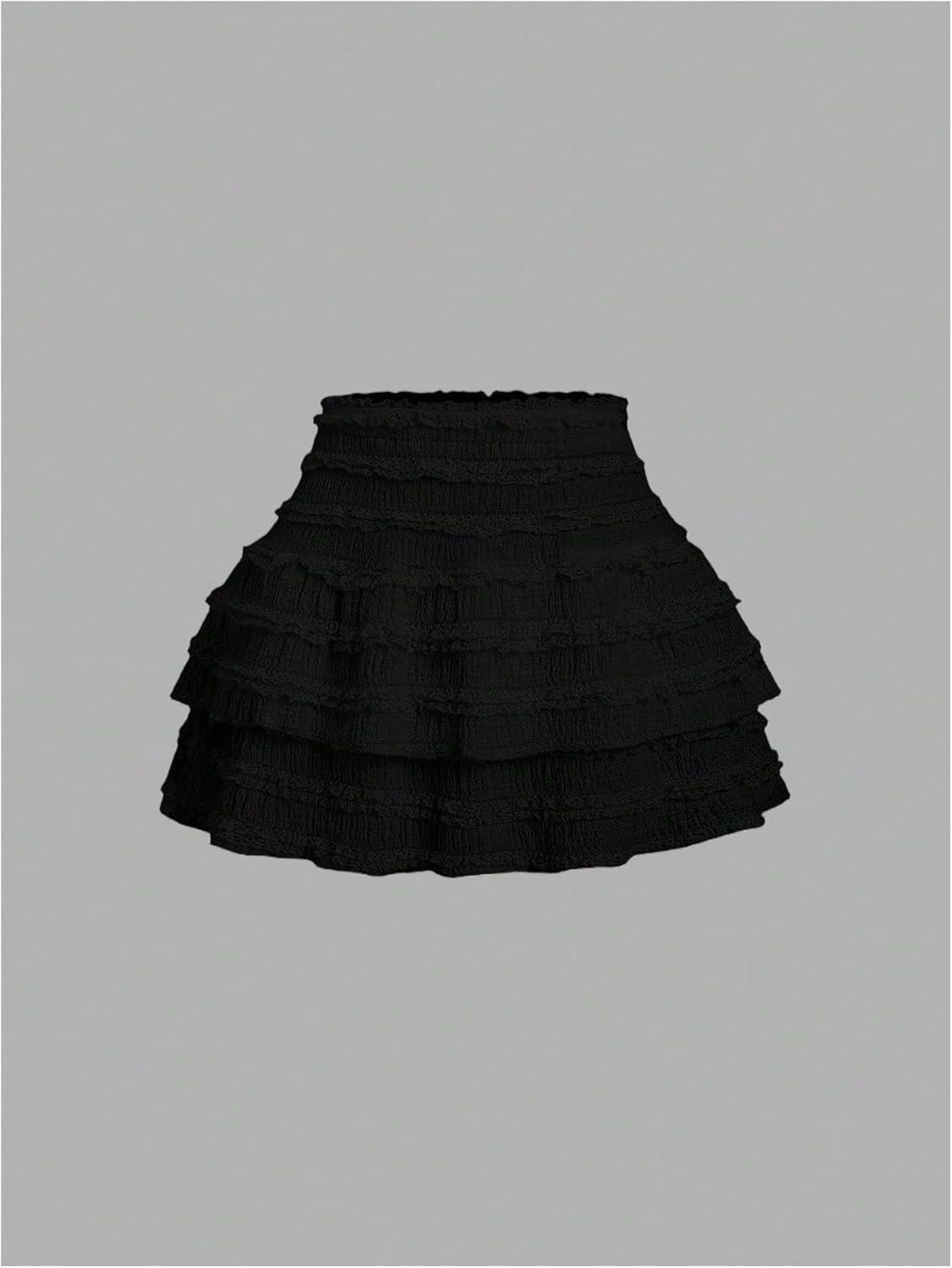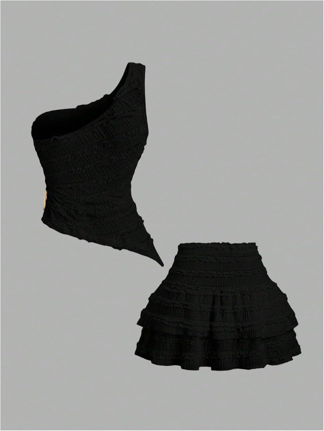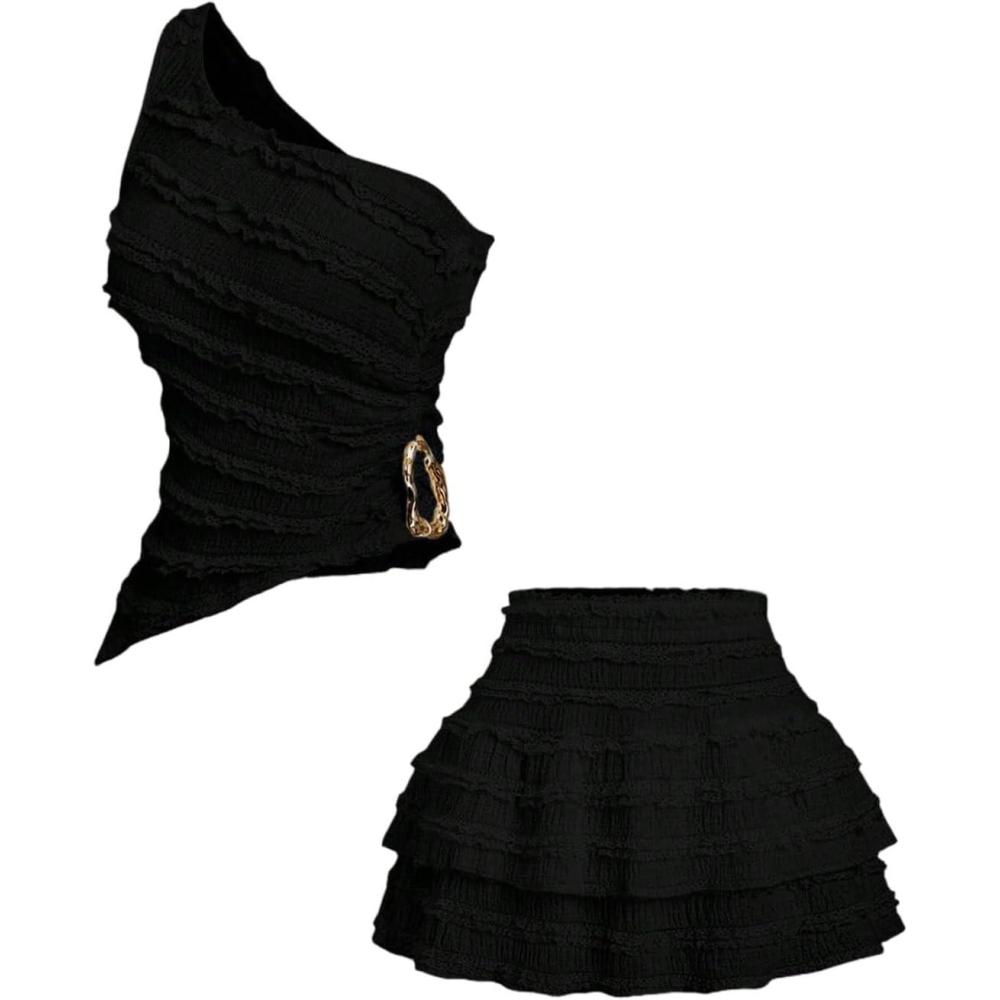 SOLY HUX Women’s 2 Piece Skirt Sets Y2k One Shoulder Tank Tops and Ruffle Layered Mini Skirt Summer Vacation Outfits(Pure Black)