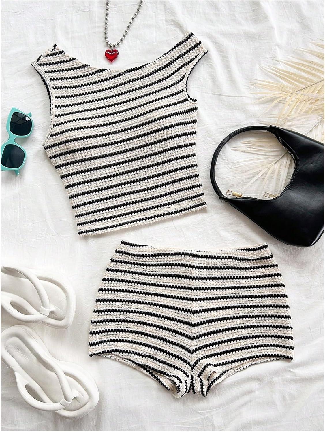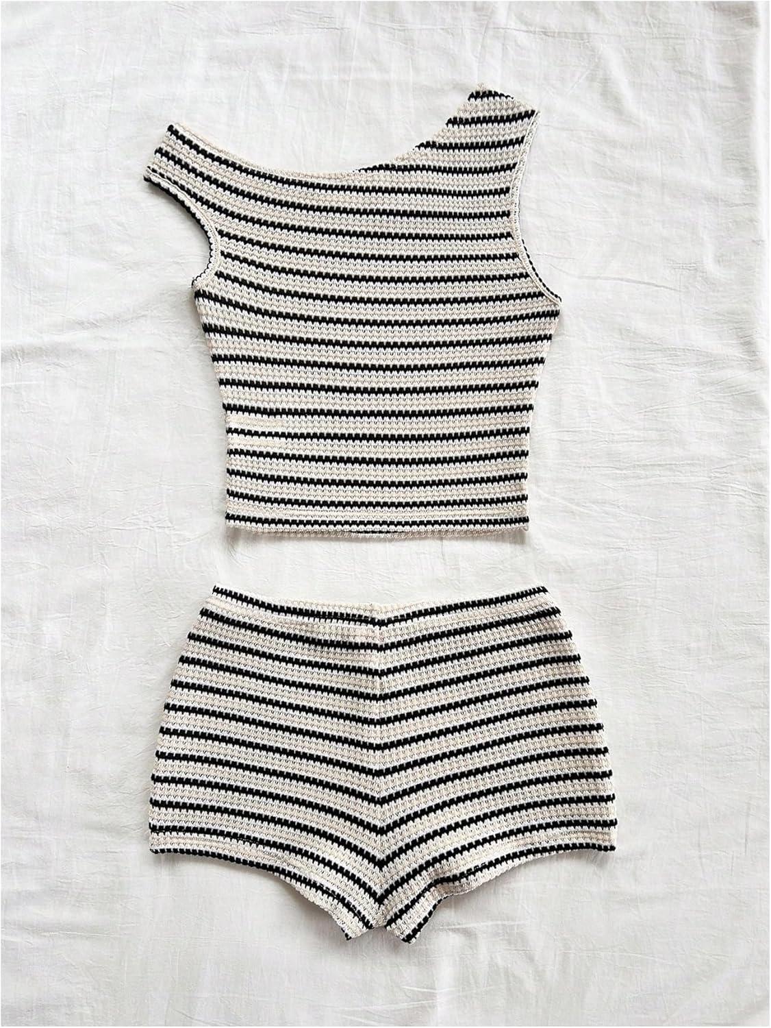 SOLY HUX Women’s 2 Piece Striped Off The Shoulder Crop Tops and Mini Shorts Set Summer Y2K Going Out Outfits(Black and White Striped)
