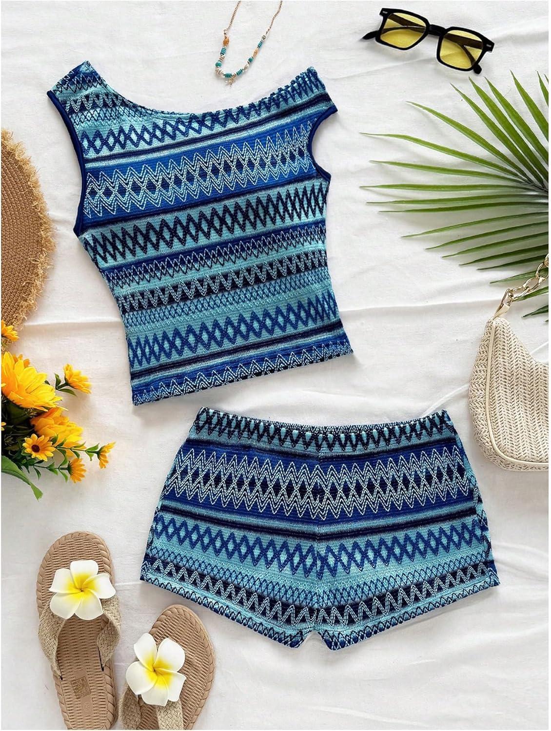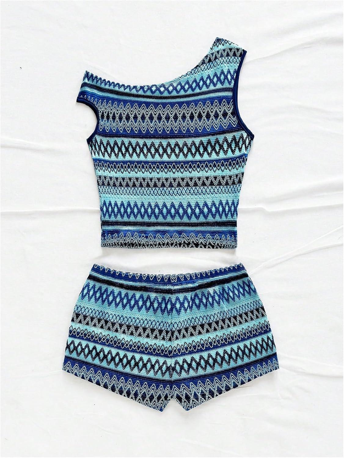 SOLY HUX Women’s 2 Piece Striped Off The Shoulder Crop Tops and Mini Shorts Set Summer Y2K Going Out Outfits(Blue Chevron)