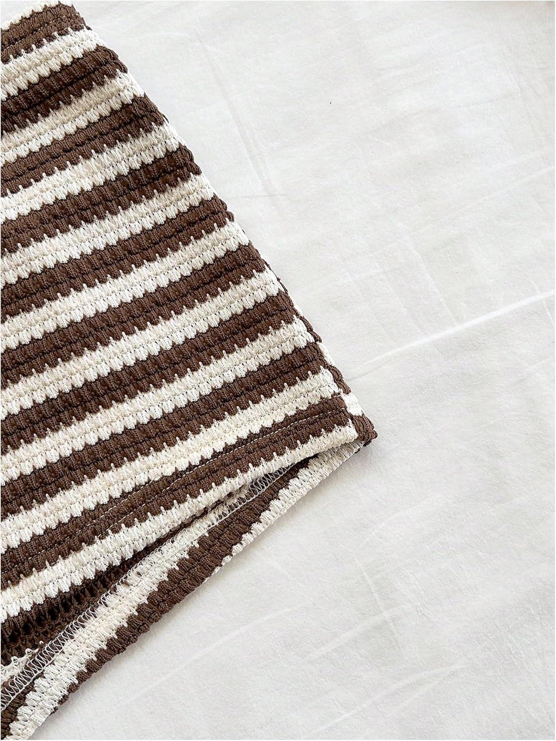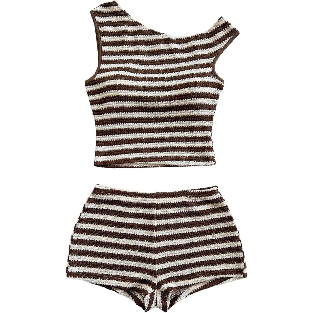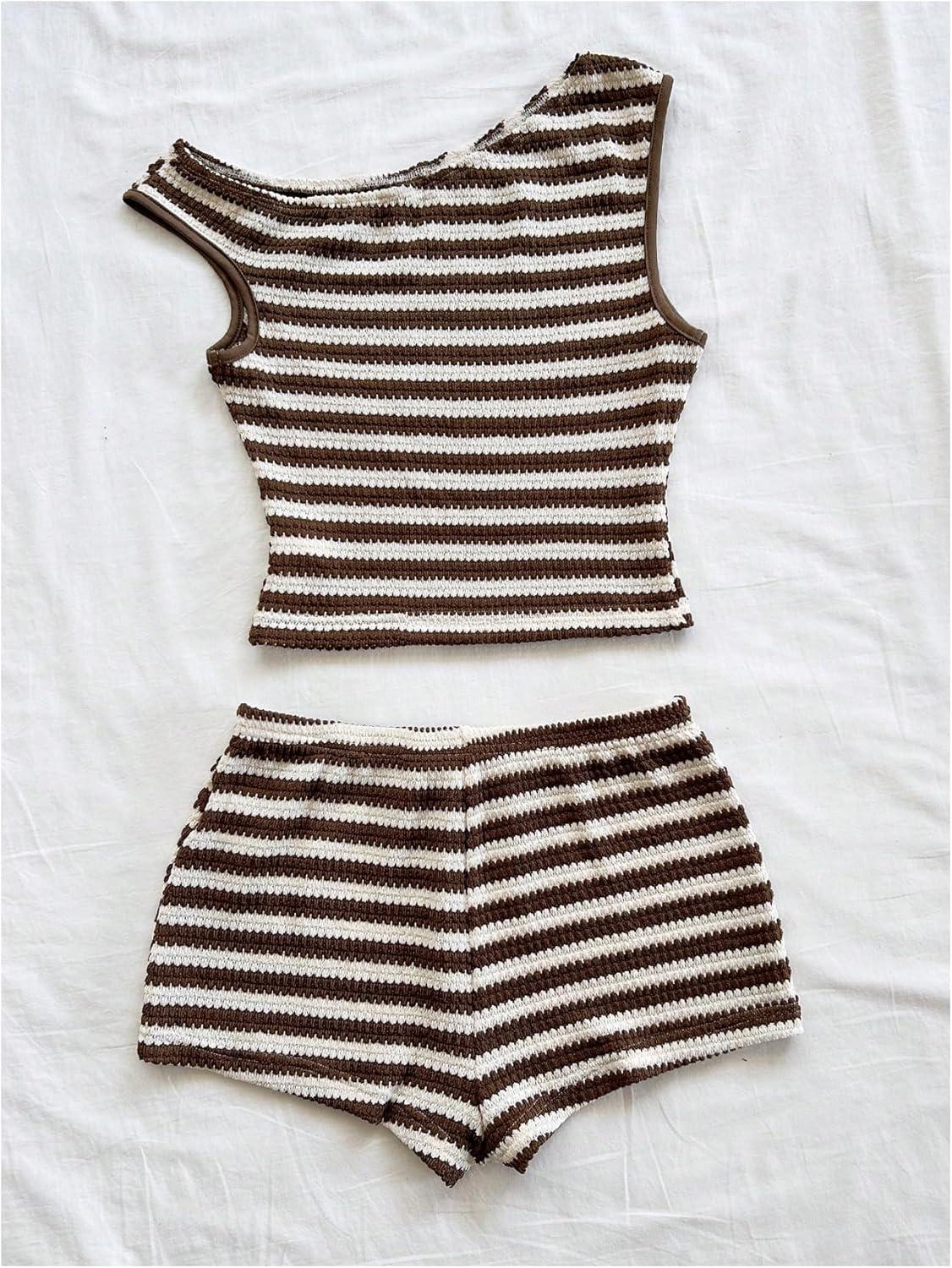 SOLY HUX Women’s 2 Piece Striped Off The Shoulder Crop Tops and Mini Shorts Set Summer Y2K Going Out Outfits(Brown Striped)