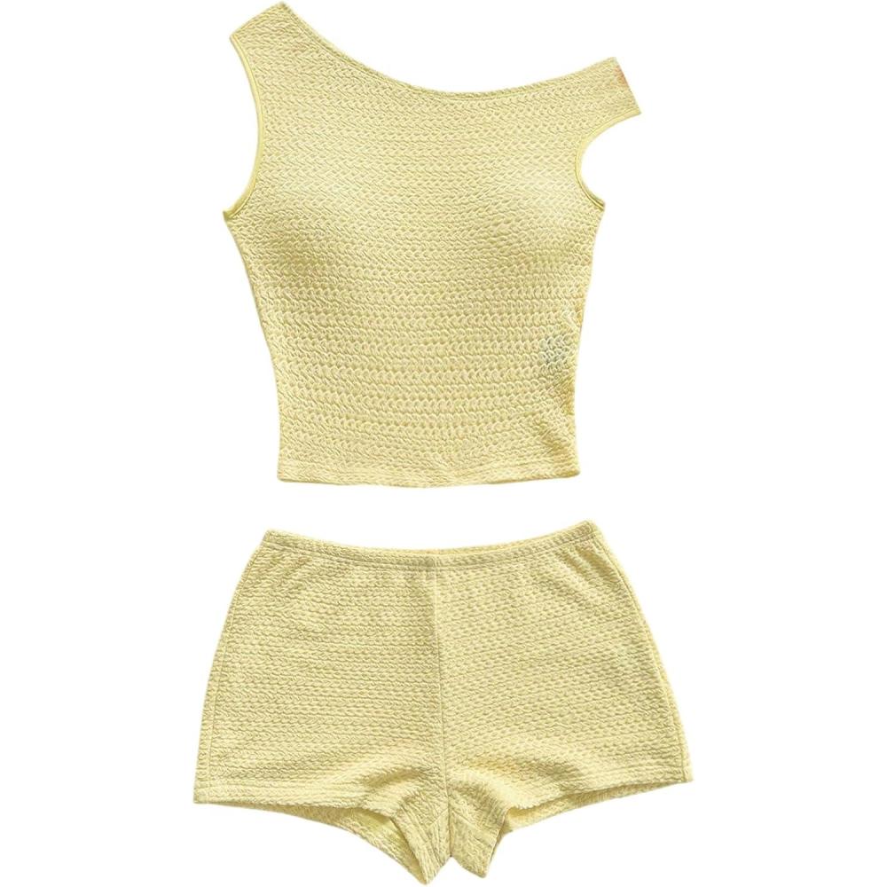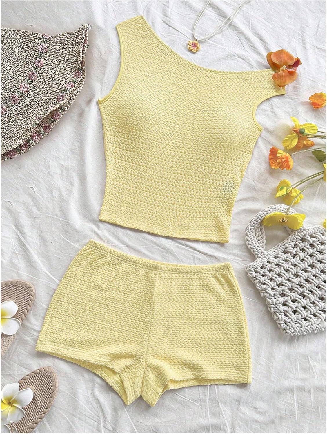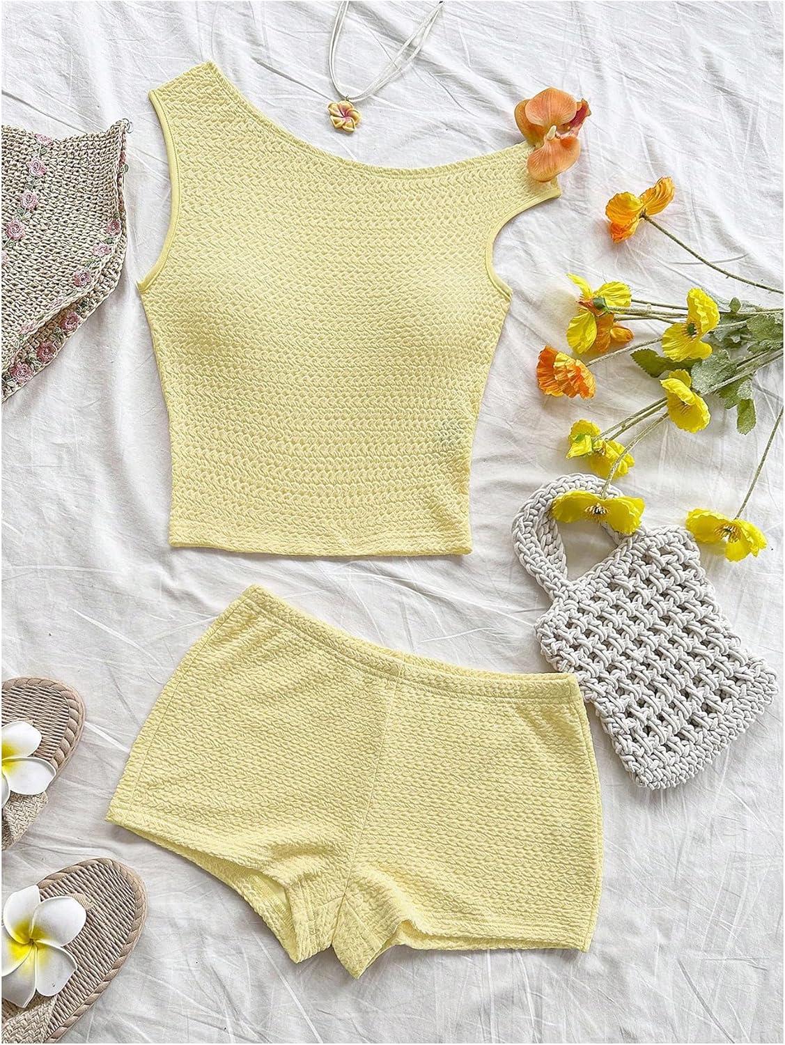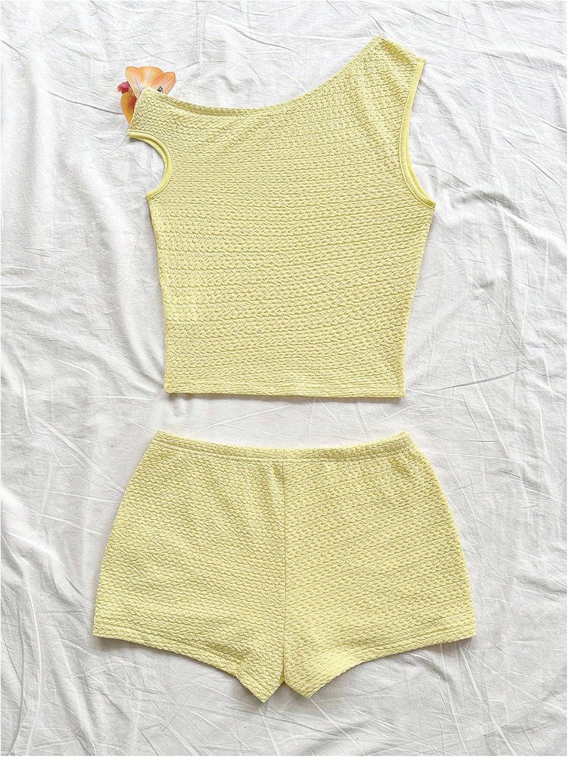 SOLY HUX Women’s 2 Piece Striped Off The Shoulder Crop Tops and Mini Shorts Set Summer Y2K Going Out Outfits(Pure Yellow Textured)