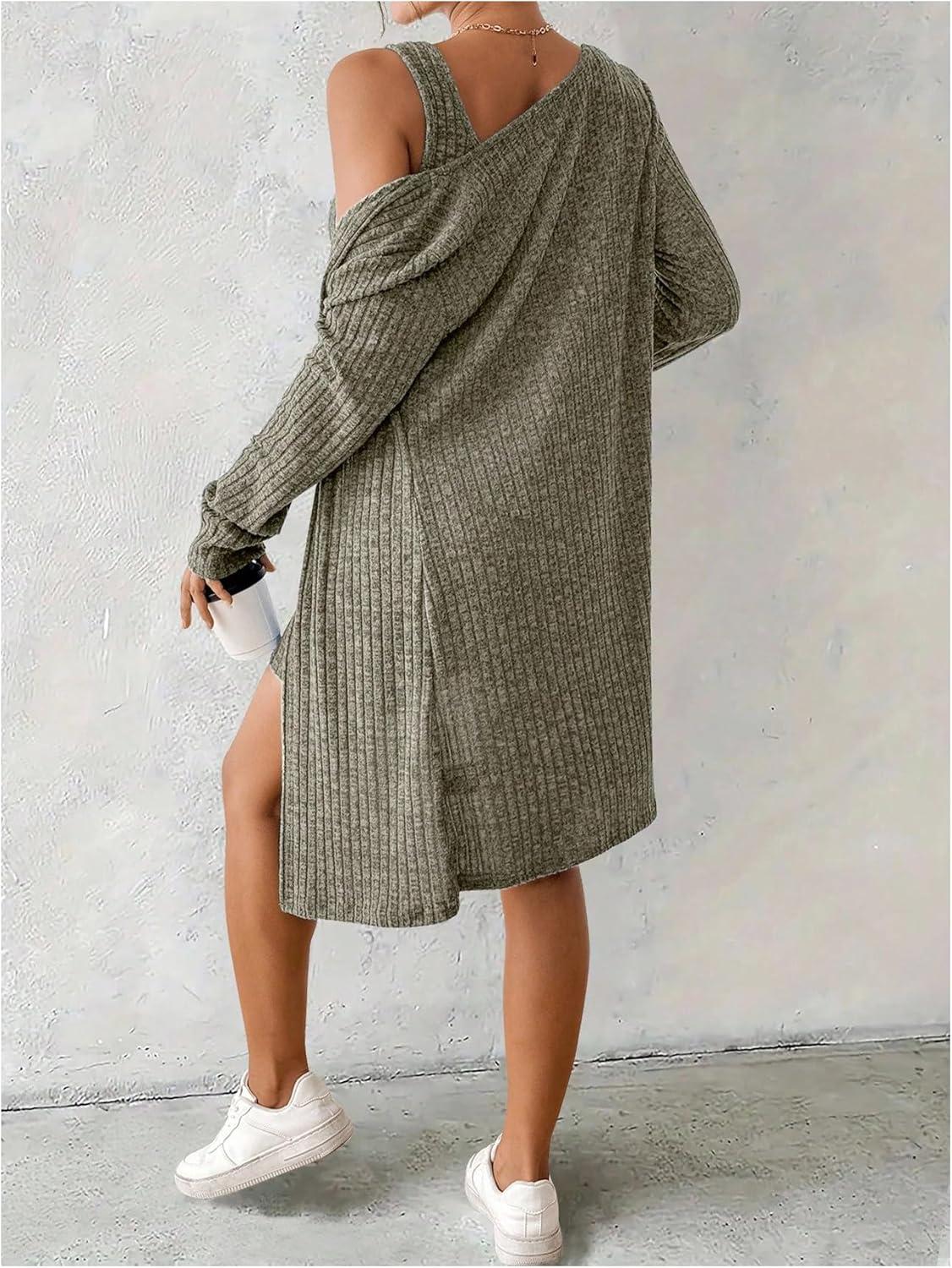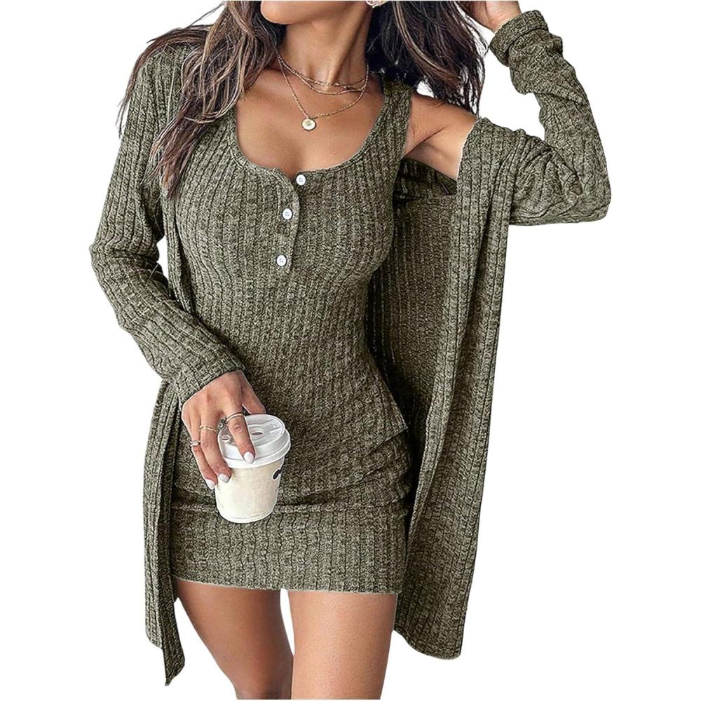 SOLY HUX Women’s 2 Piece Sweater Dress Set Knit Long Sleeve Open Front Cardigan and Bodycon Mini Dress Fall Outfit(Pure Army Green)
