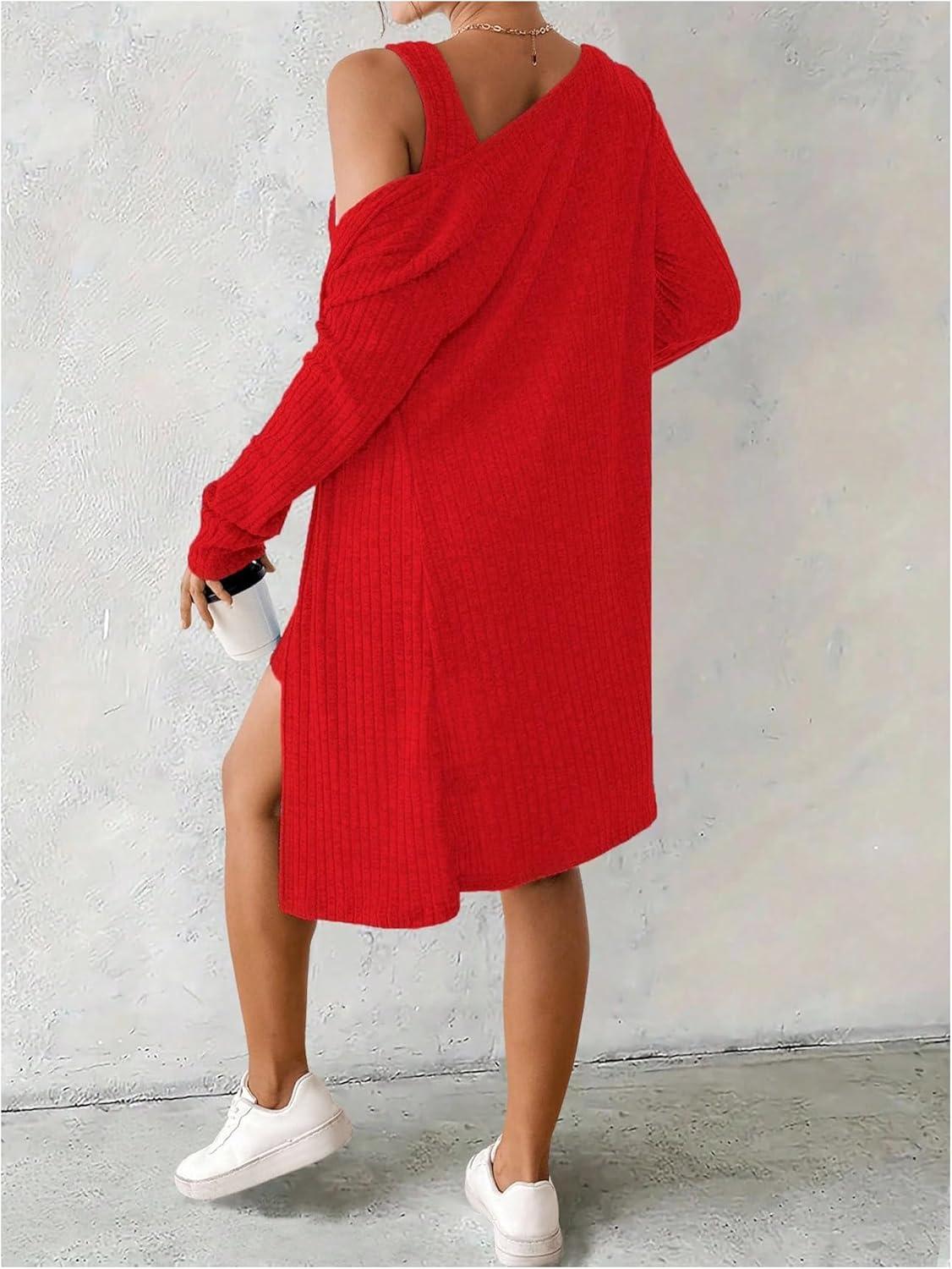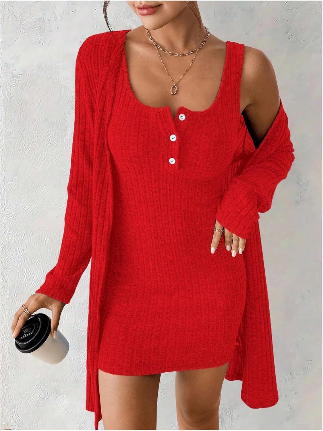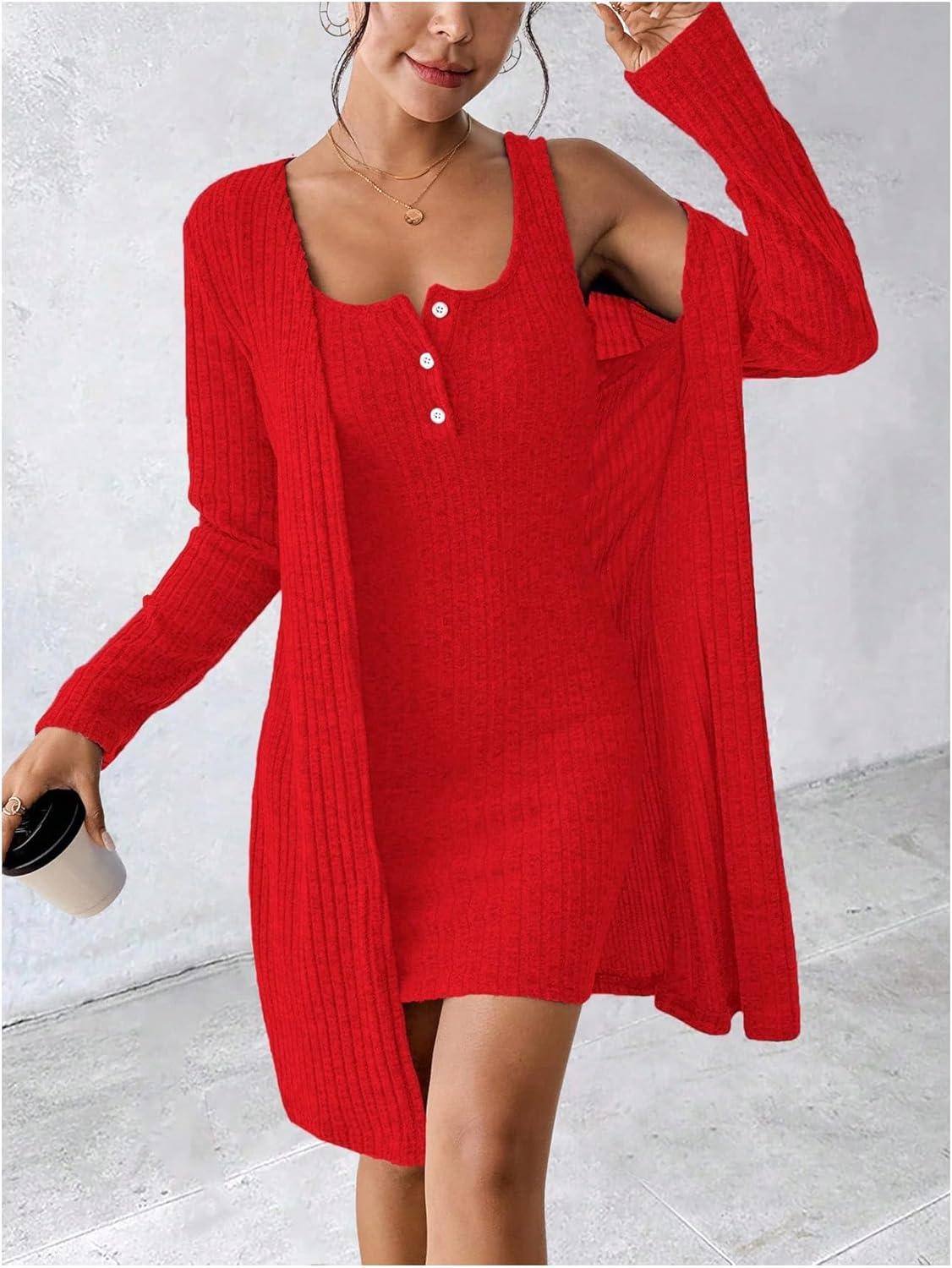 SOLY HUX Women’s 2 Piece Sweater Dress Set Knit Long Sleeve Open Front Cardigan and Bodycon Mini Dress Fall Outfit(Pure Red)
