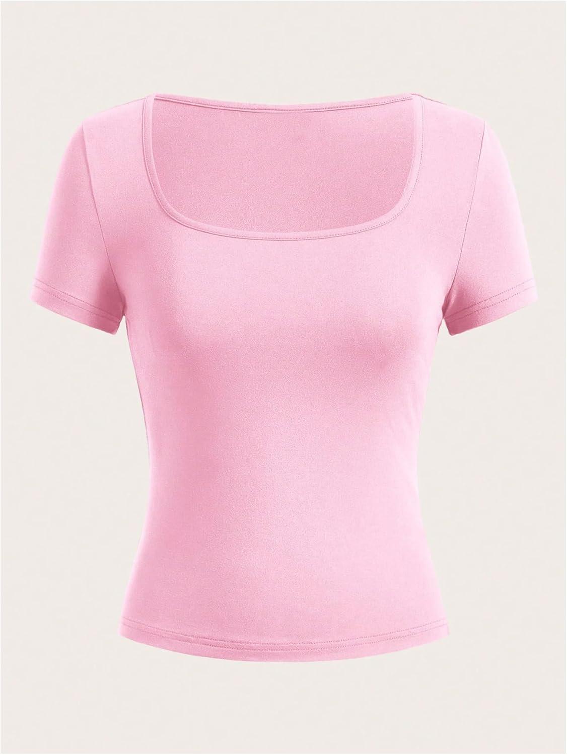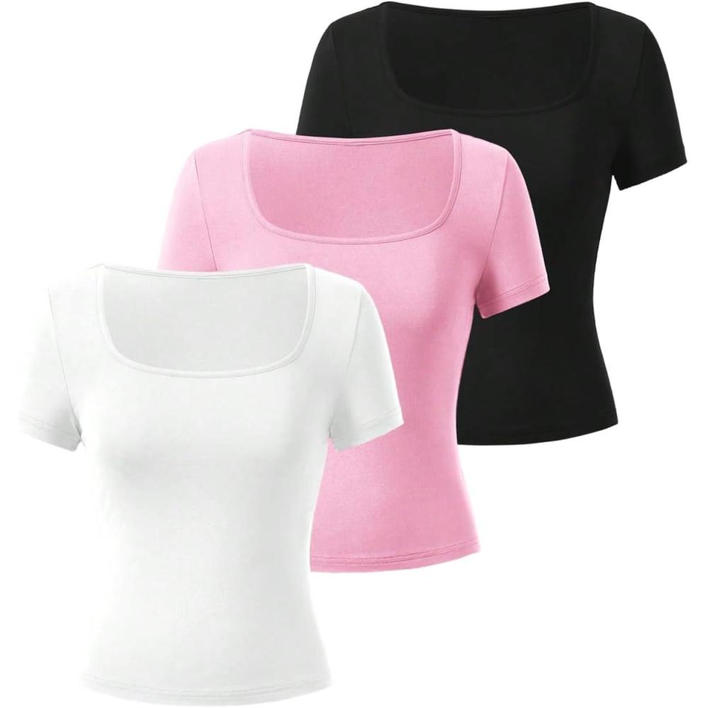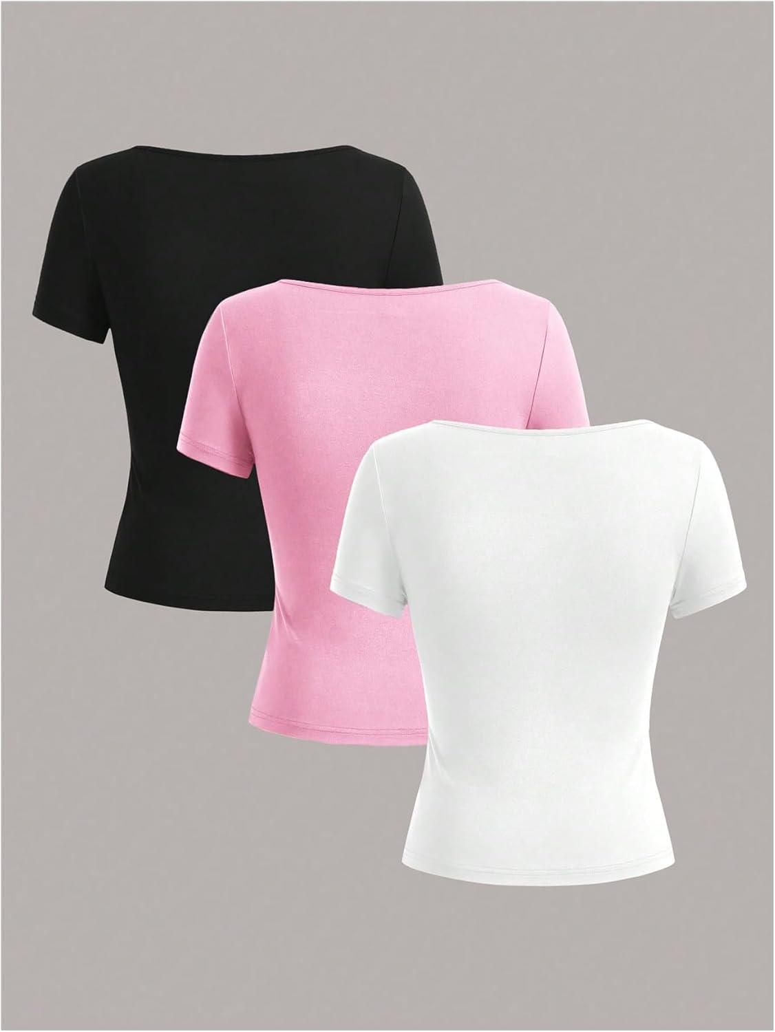 SOLY HUX Women’s 3 Piece Square Neck T Shirts Summer Short Sleeve Fitted Dressy Casual Tops(Multicolor Pink)