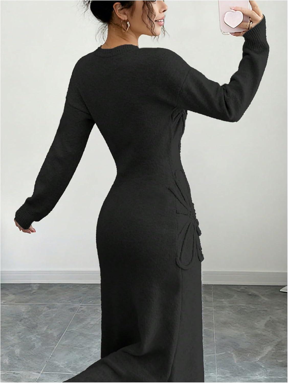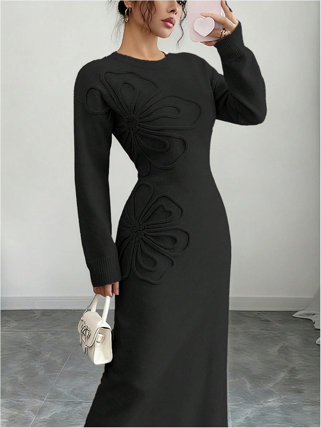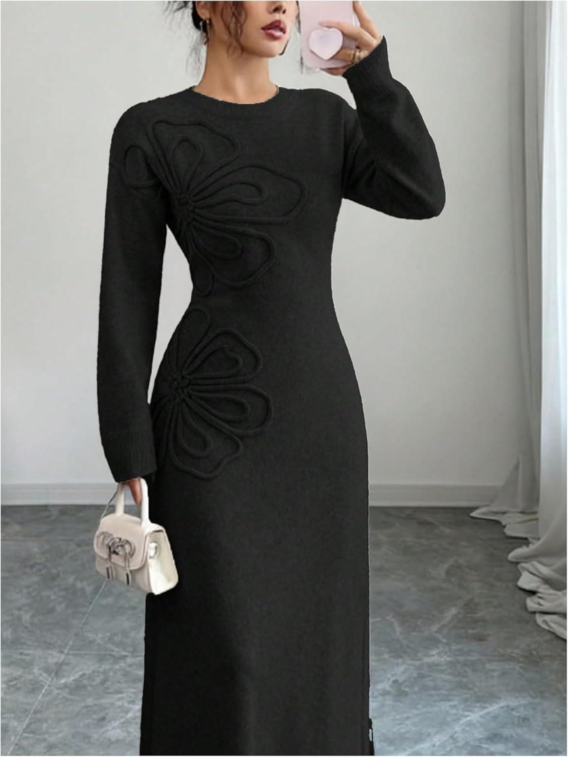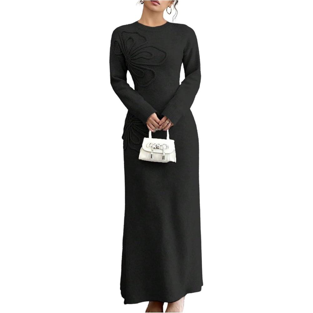 SOLY HUX Women’s 3D Floral Sweater Dress Long Sleeve Crew Neck Knit Fall Winter Long Dresses(Black)