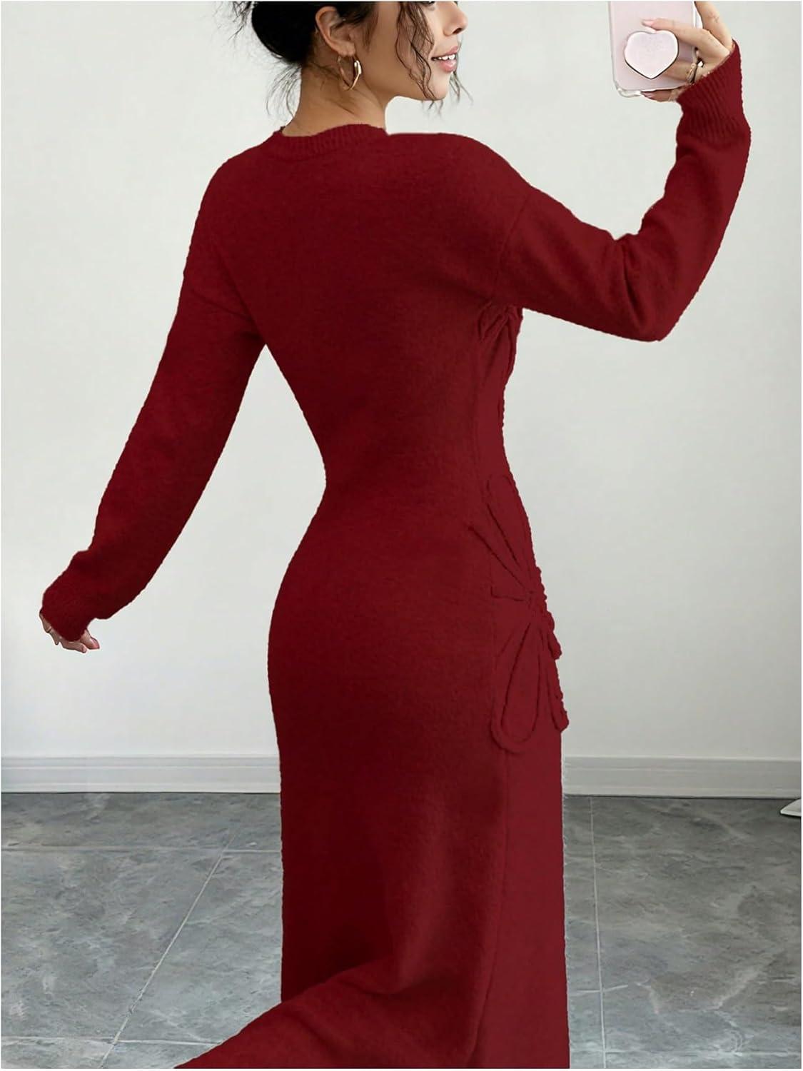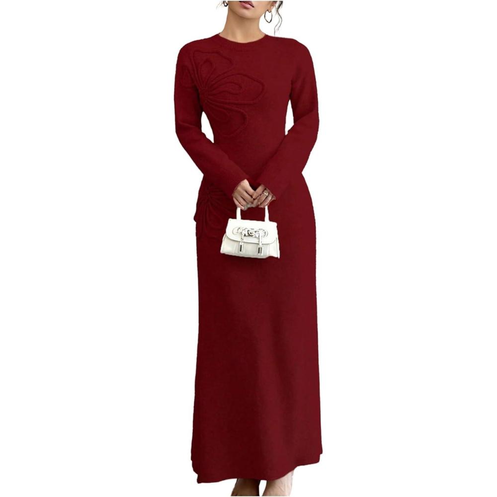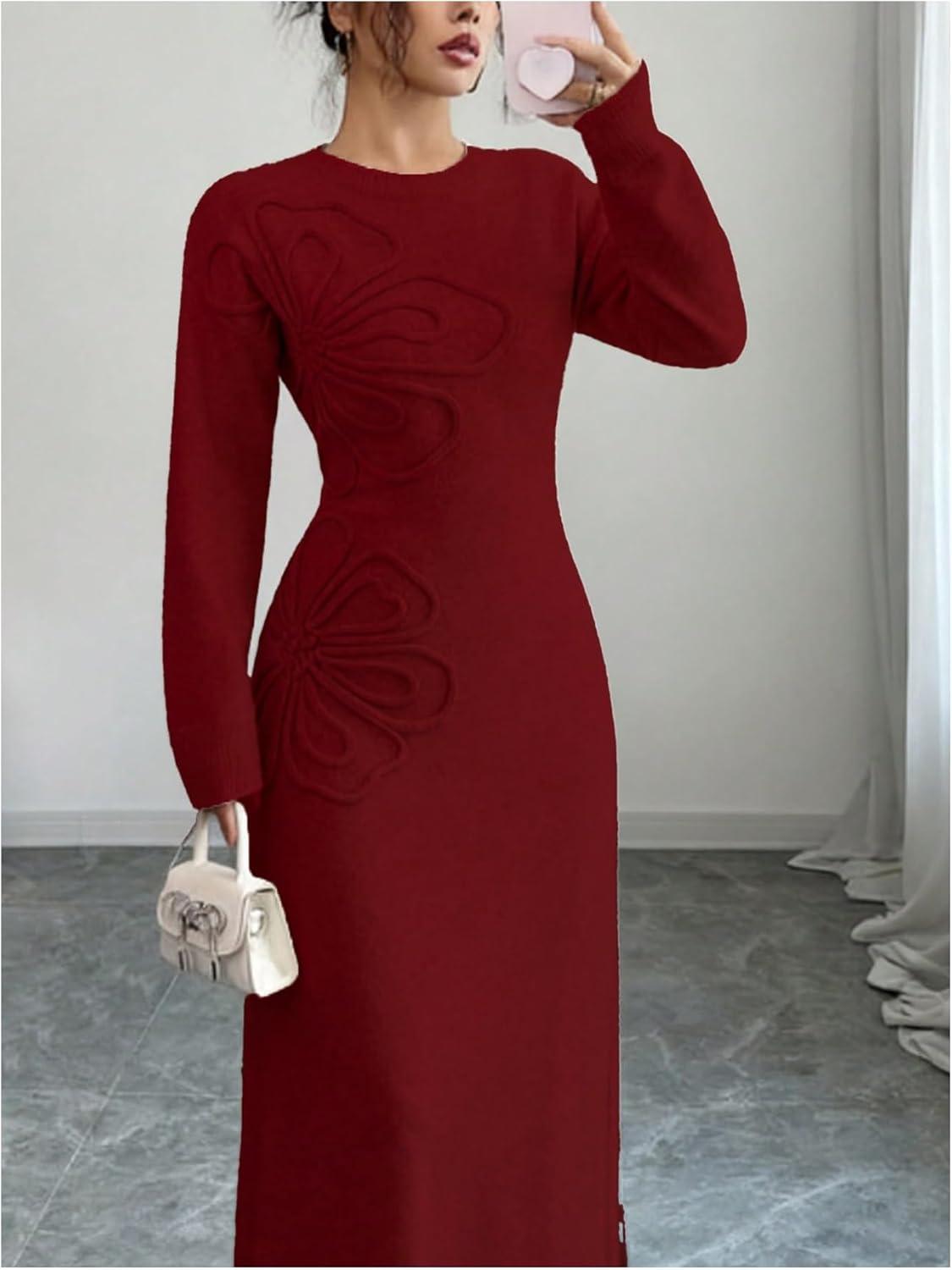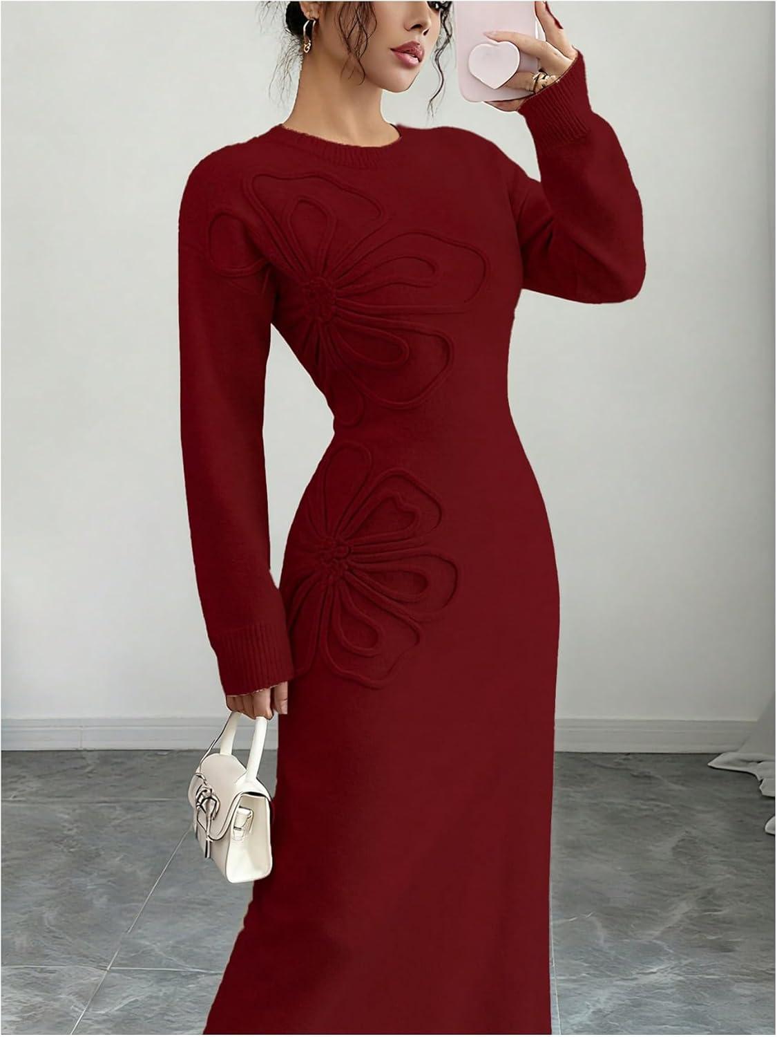 SOLY HUX Women’s 3D Floral Sweater Dress Long Sleeve Crew Neck Knit Fall Winter Long Dresses(Burgundy)