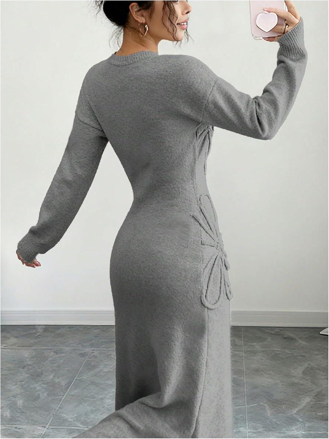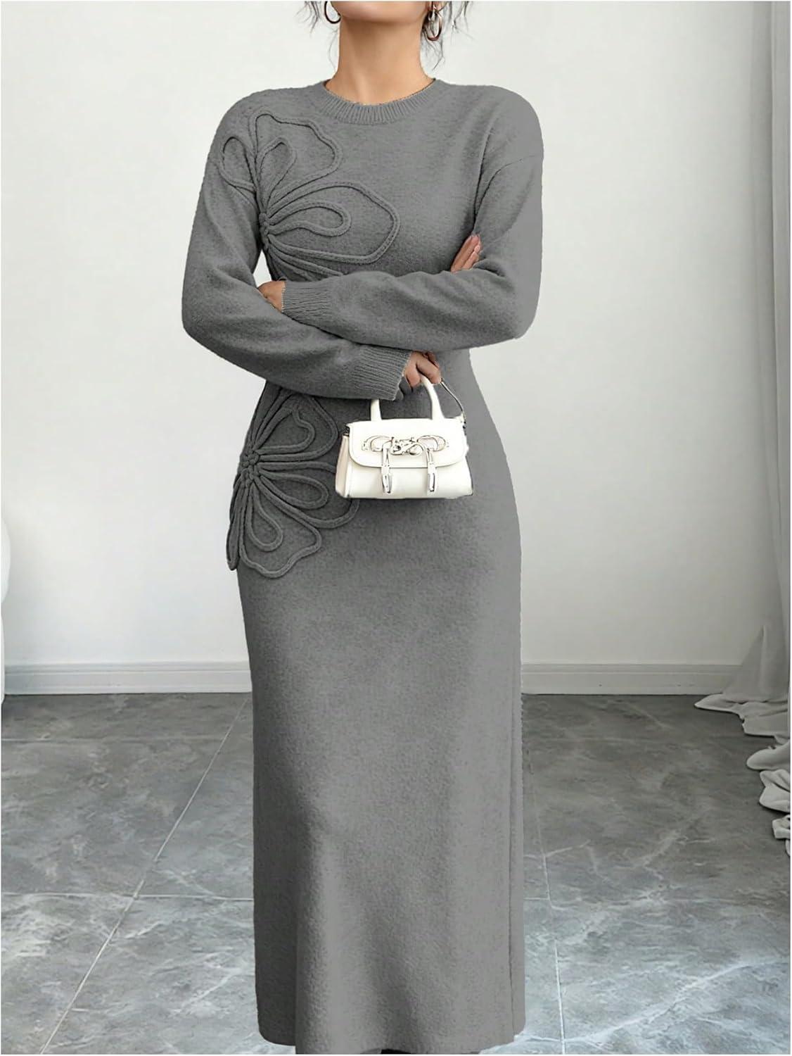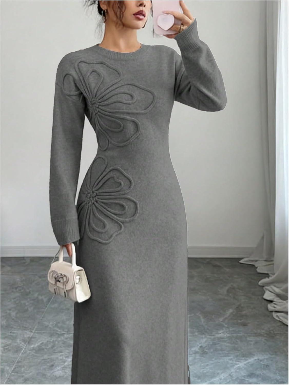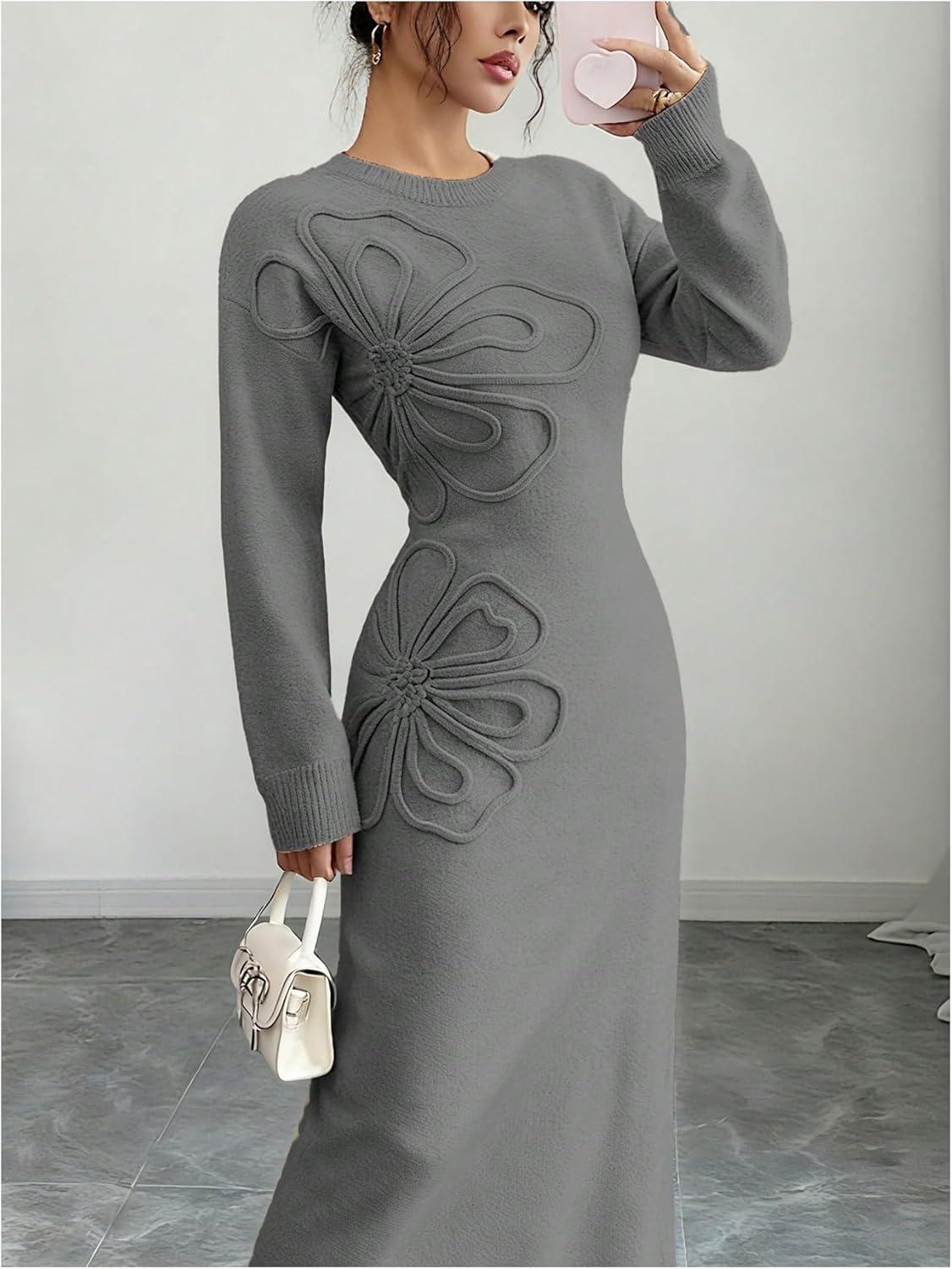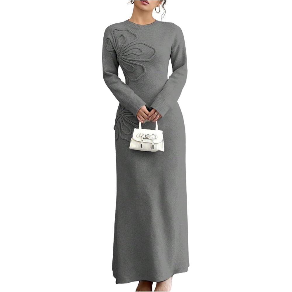 SOLY HUX Women’s 3D Floral Sweater Dress Long Sleeve Crew Neck Knit Fall Winter Long Dresses(Grey)