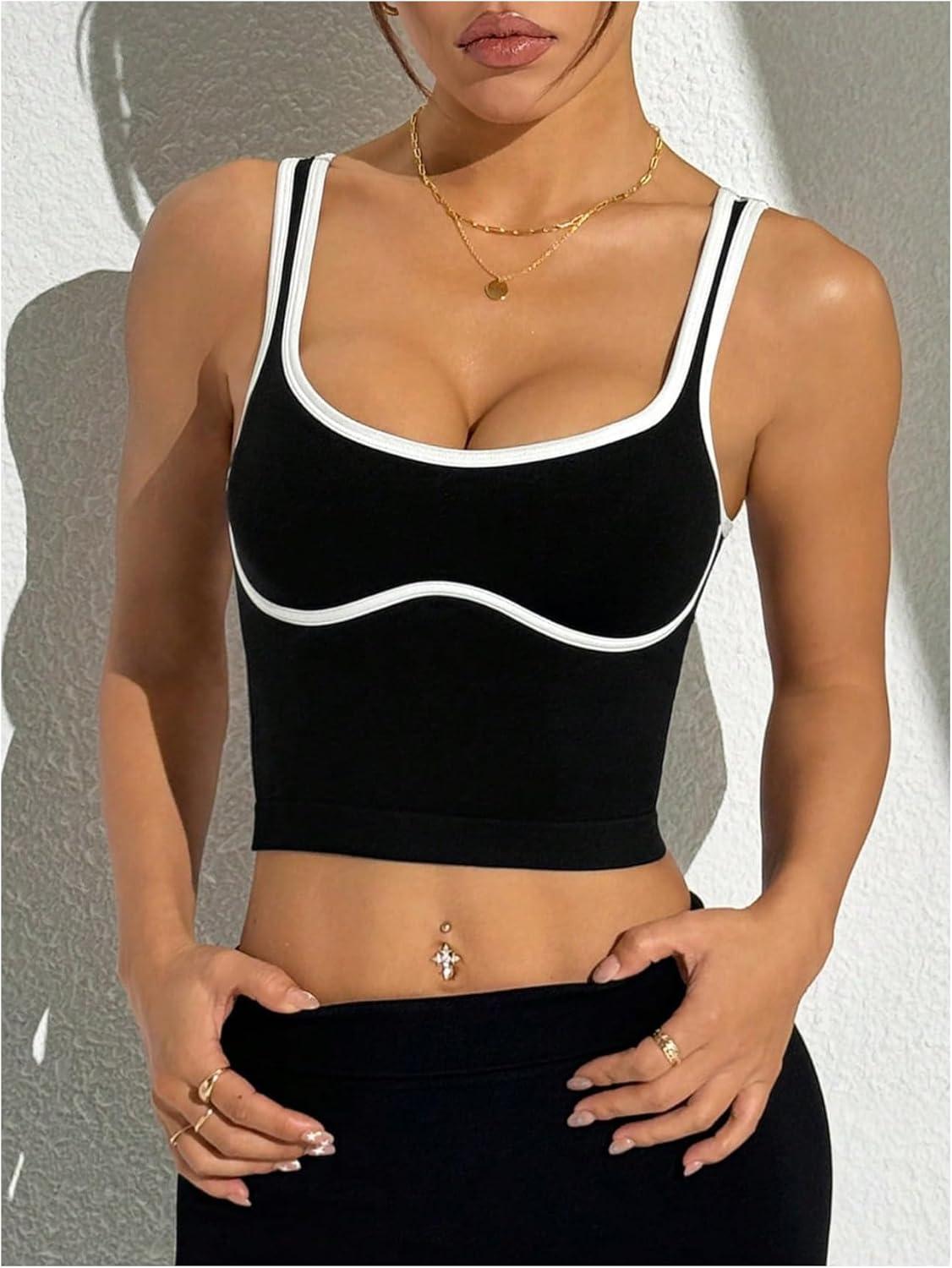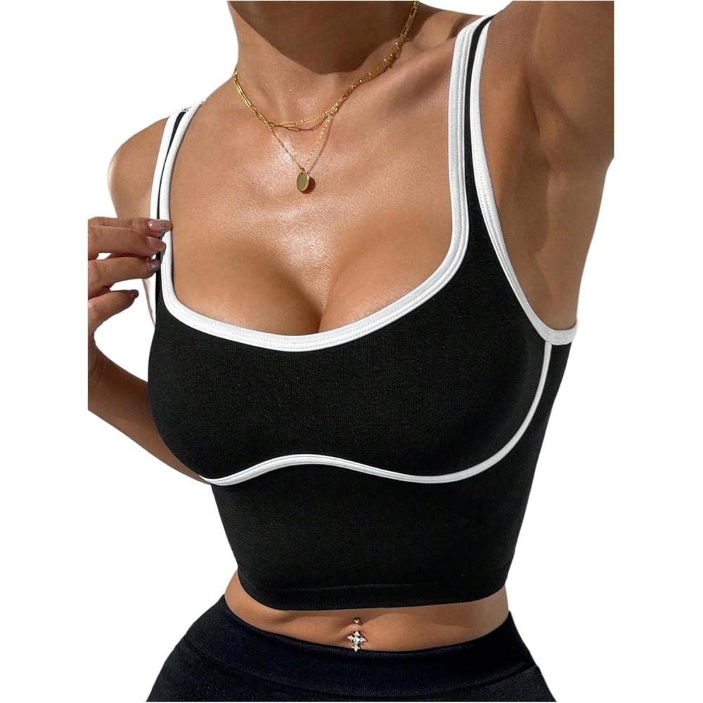 SOLY HUX Women’s Athletic Tops Scoop Neck Sleeveless Contrast Binding Workout Yoga Crop Tank Top(Black and White)