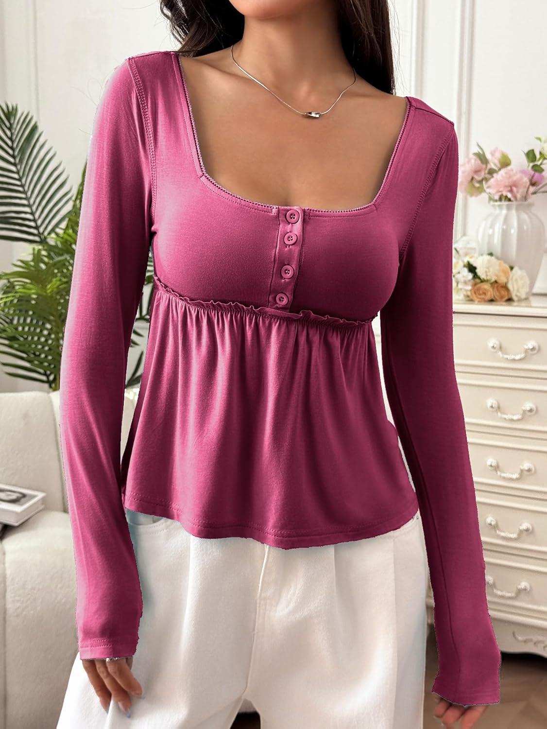SOLY HUX Women’s Babydoll Tops Long Sleeve Henley Shirts Cute Square Neck Coquette Peplum Top(Dusty Pink)