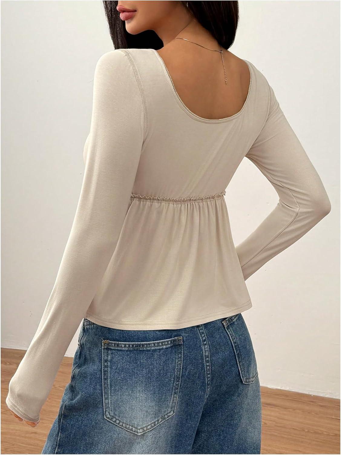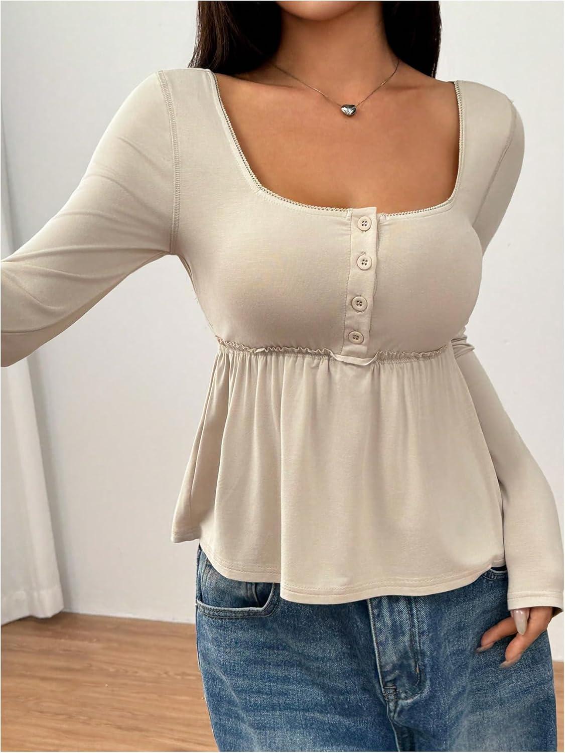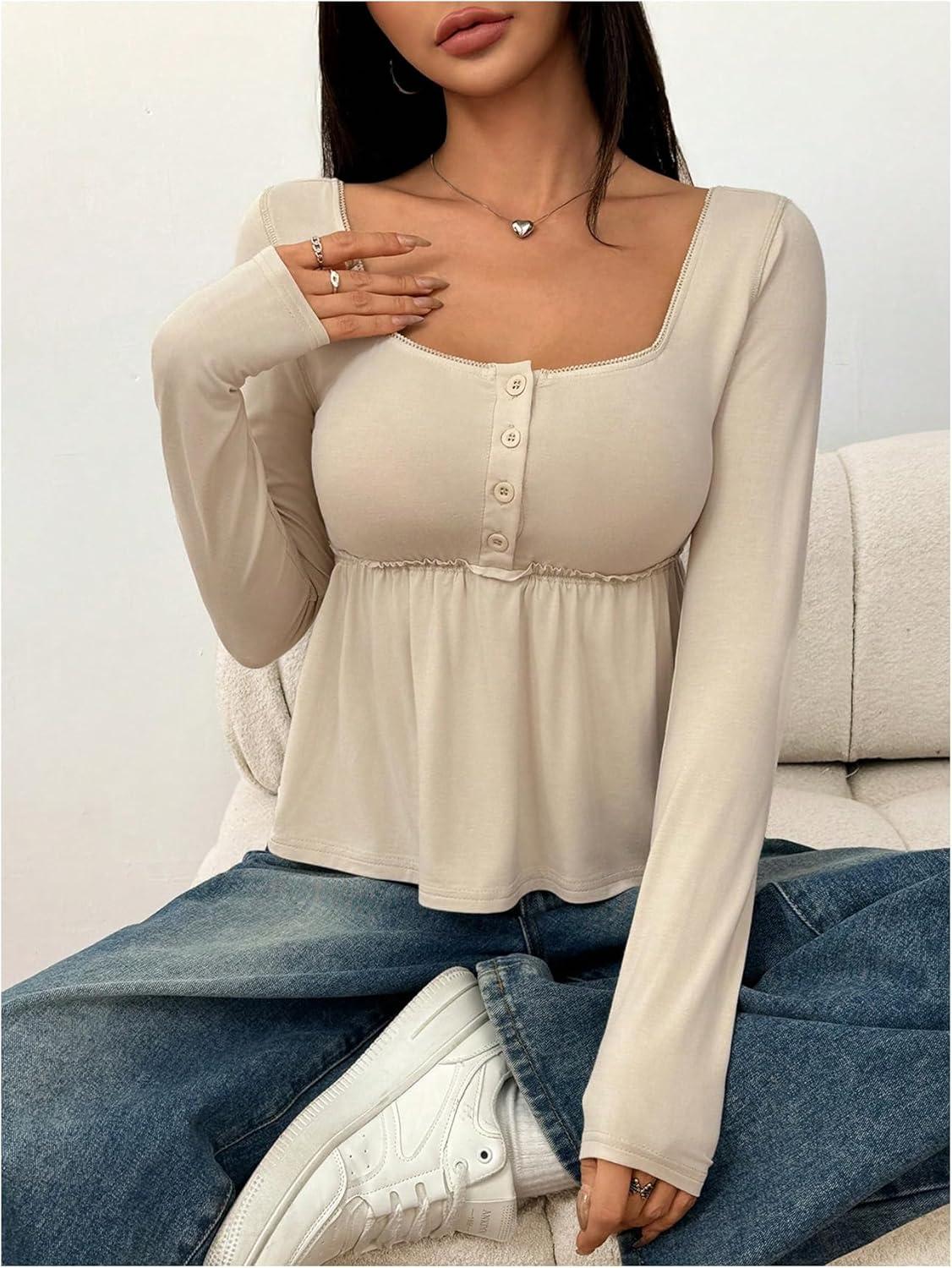 SOLY HUX Women’s Babydoll Tops Long Sleeve Henley Shirts Cute Square Neck Coquette Peplum Top(Solid Apricot)
