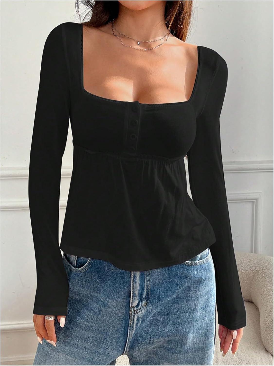 SOLY HUX Women’s Babydoll Tops Long Sleeve Henley Shirts Cute Square Neck Coquette Peplum Top(Solid Black)
