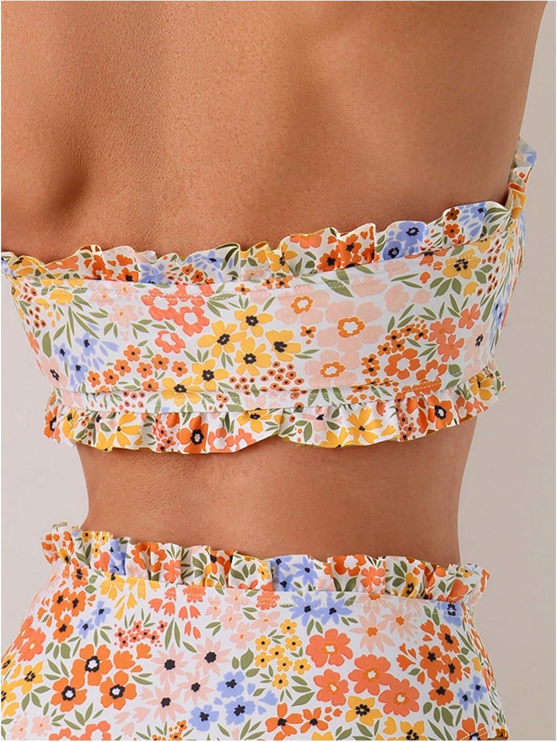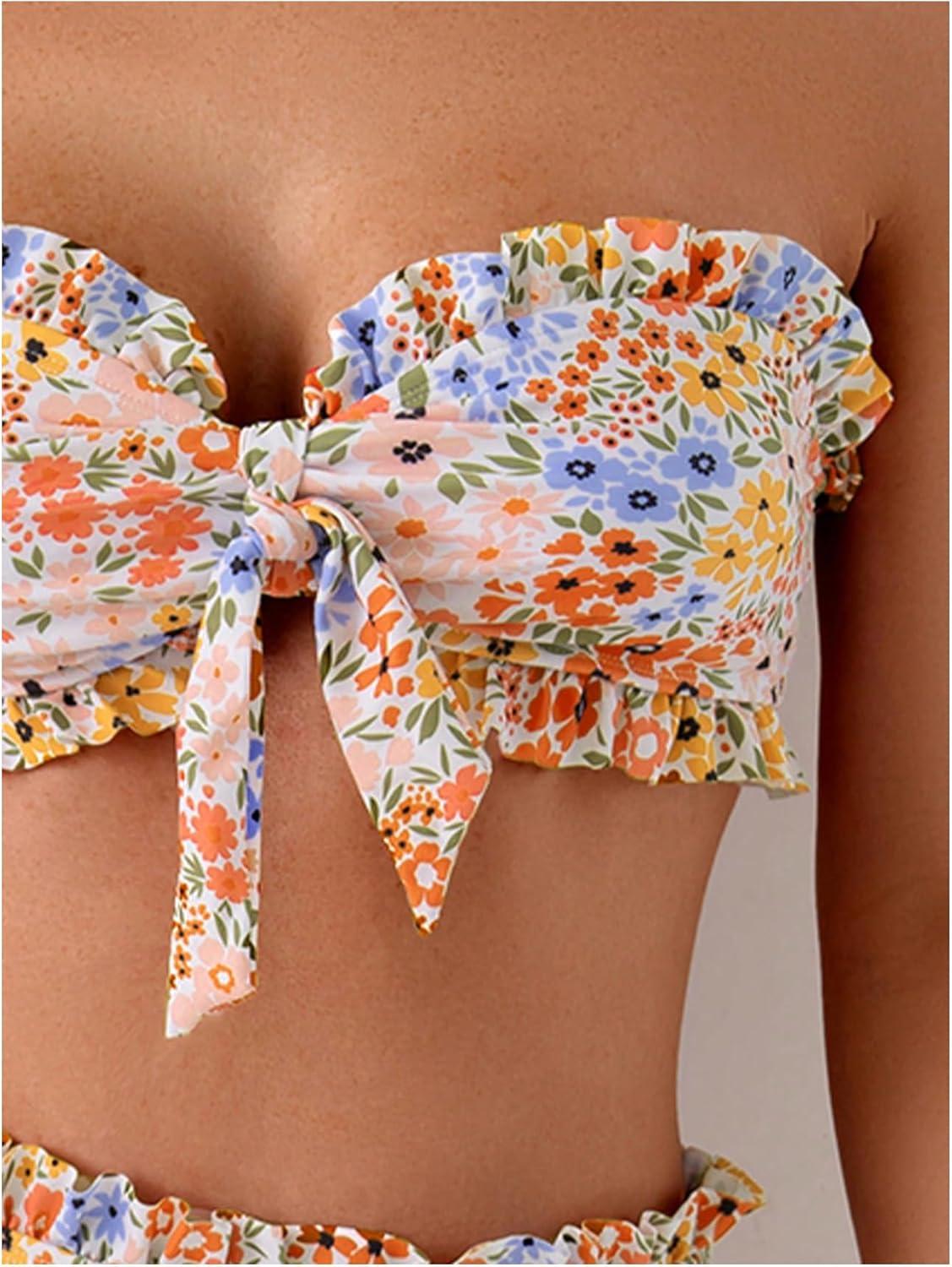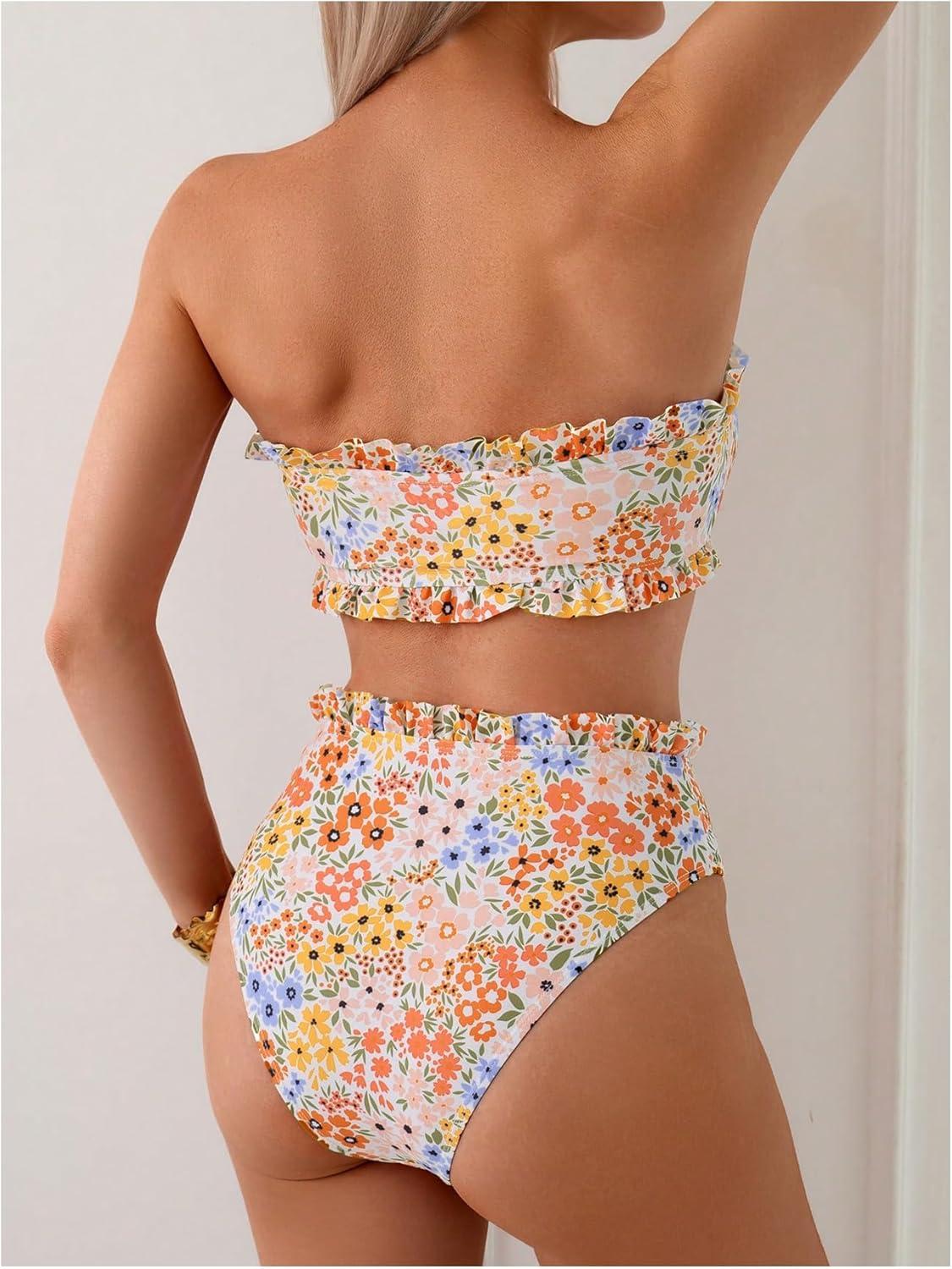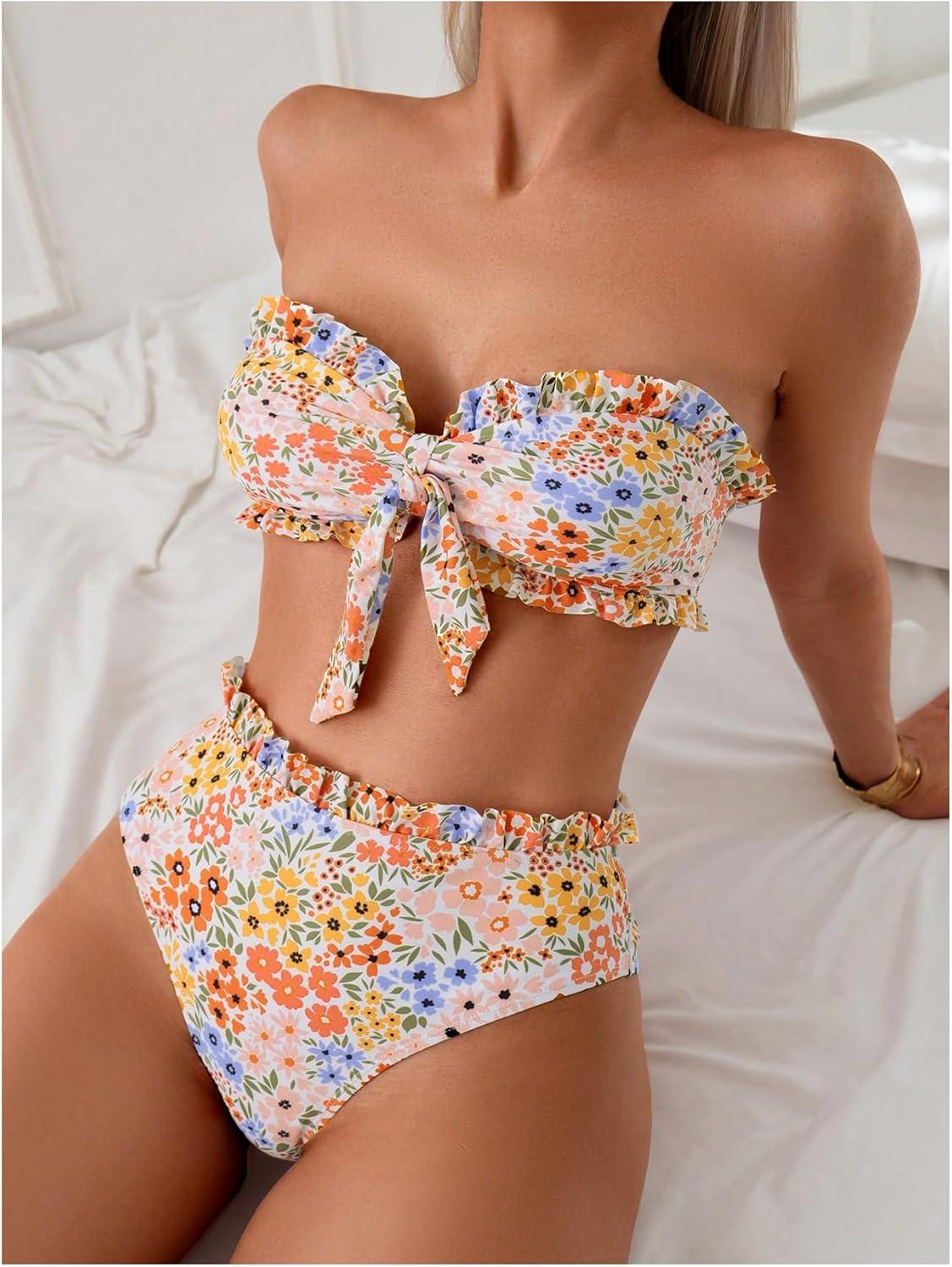 SOLY HUX Women’s Bandeau Bikini Set Tie Knot Front Frill Strapless High Waisted Bathing Suit Two Piece Swimsuit(Multicoloured Flower)