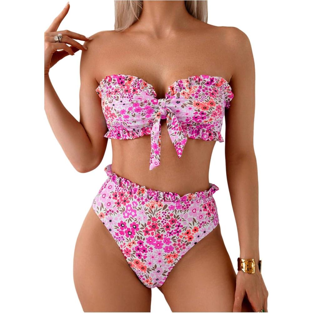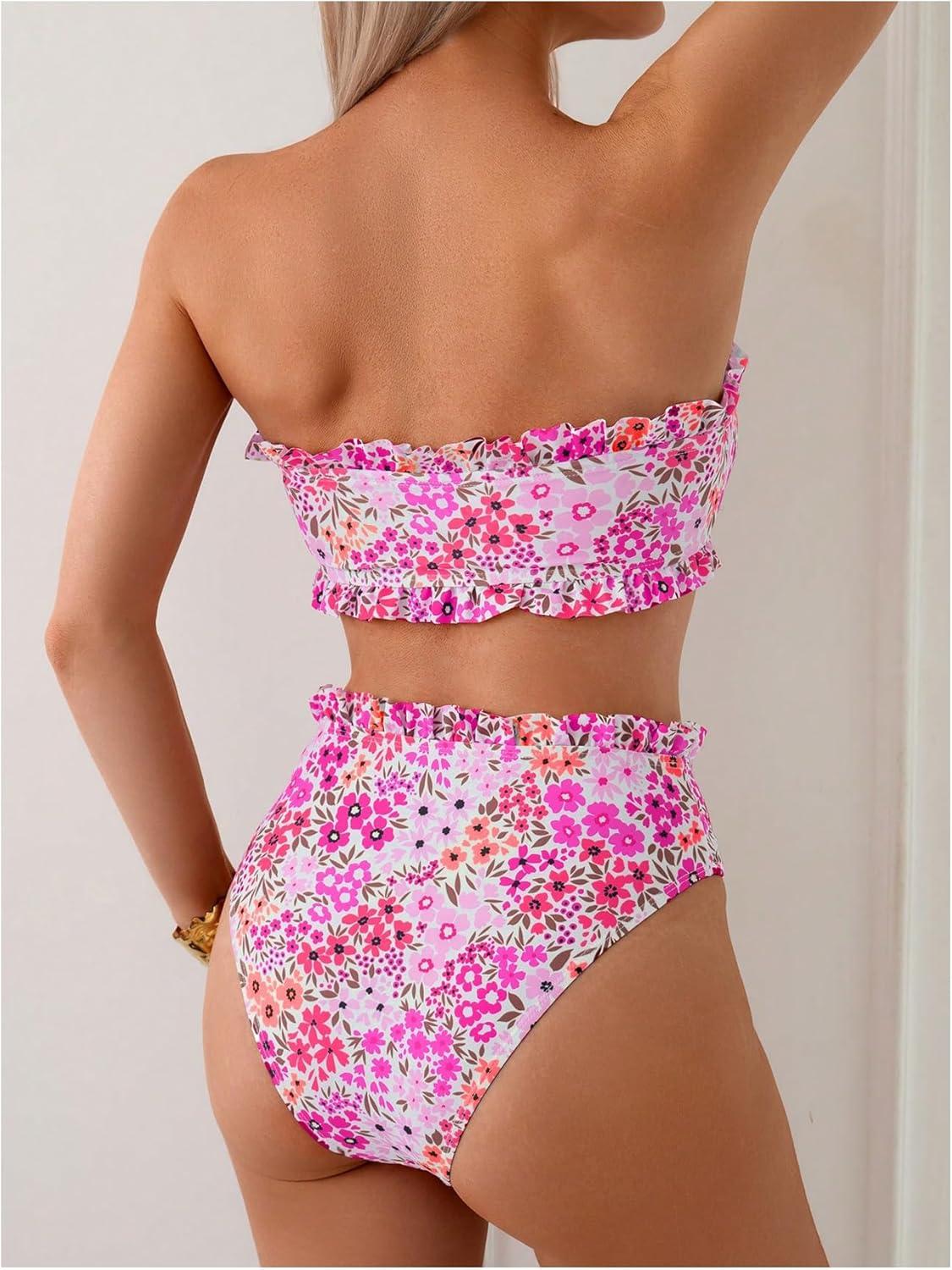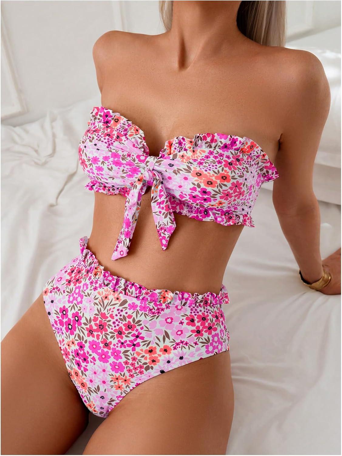 SOLY HUX Women’s Bandeau Bikini Set Tie Knot Front Frill Strapless High Waisted Bathing Suit Two Piece Swimsuit(Multicoloured Floral)