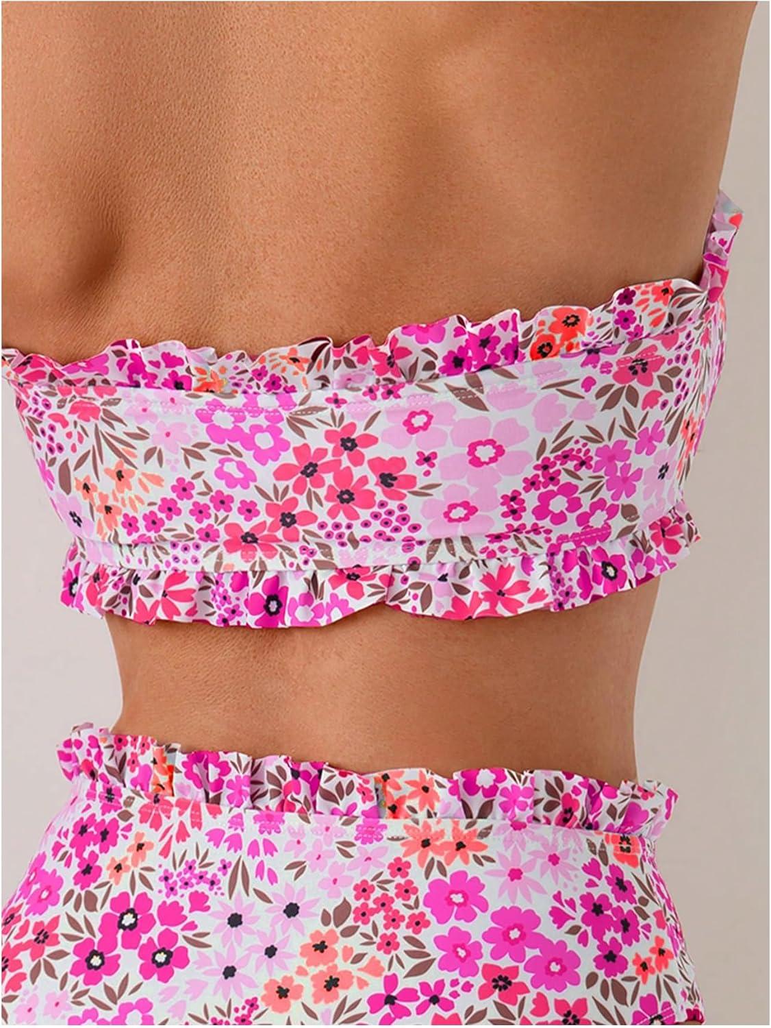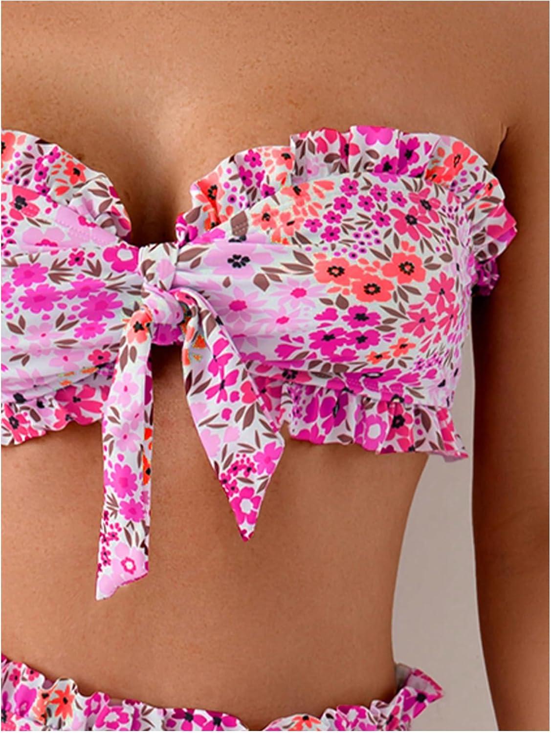 SOLY HUX Women’s Bandeau Bikini Set Tie Knot Front Frill Strapless High Waisted Bathing Suit Two Piece Swimsuit(Pink Floral)