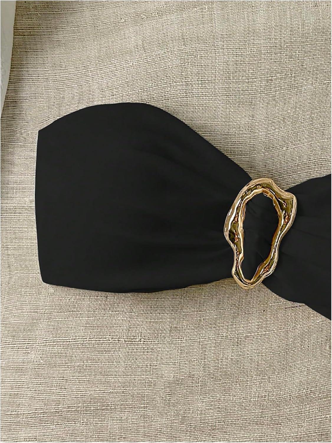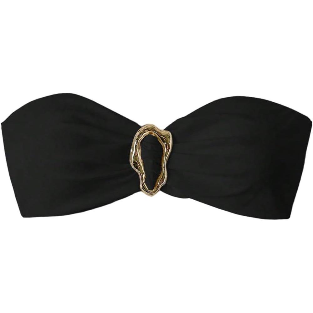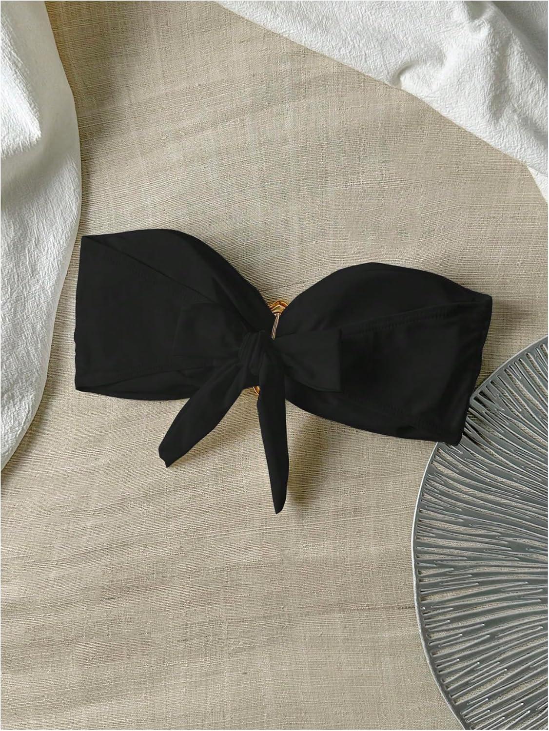SOLY HUX Women’s Bandeau Bikini Top Ruched Strapless Tie Back Swimsuit Bathing Suit Tops(Plain Black)