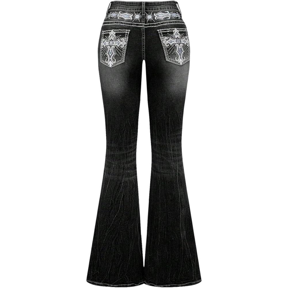 SOLY HUX Women’s Bell Bottom Jeans Embroidery Y2k Stretch Flare Denim Pants(Black Graphic Embroidery)