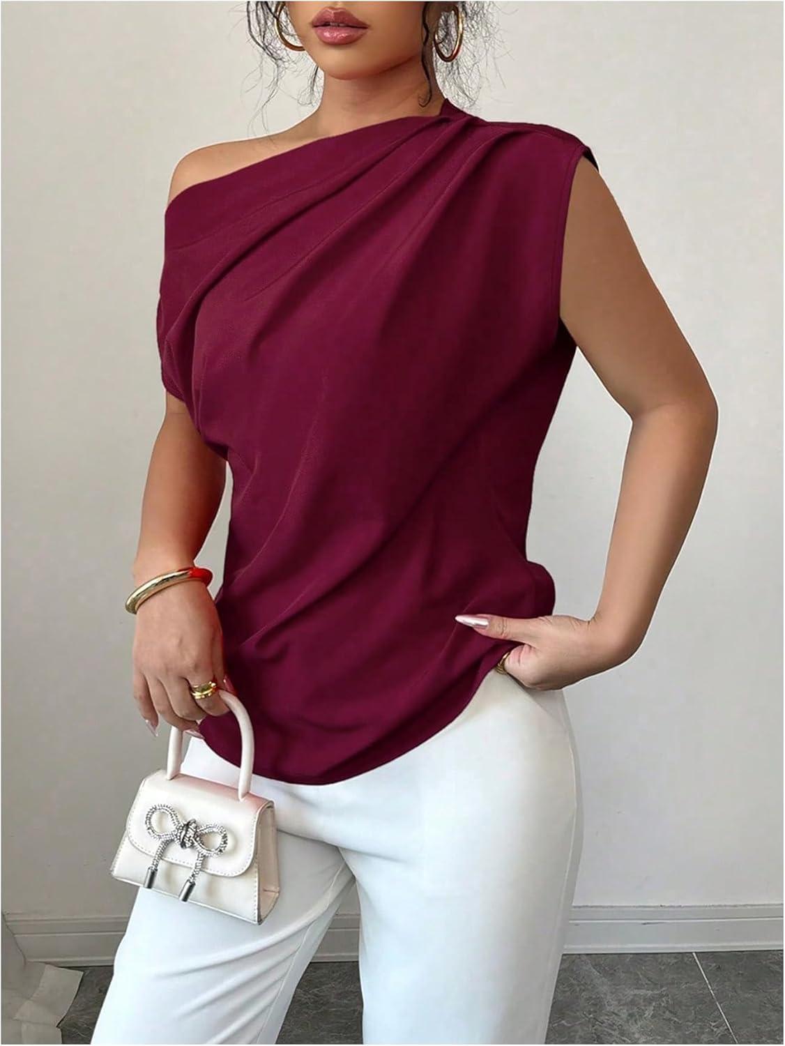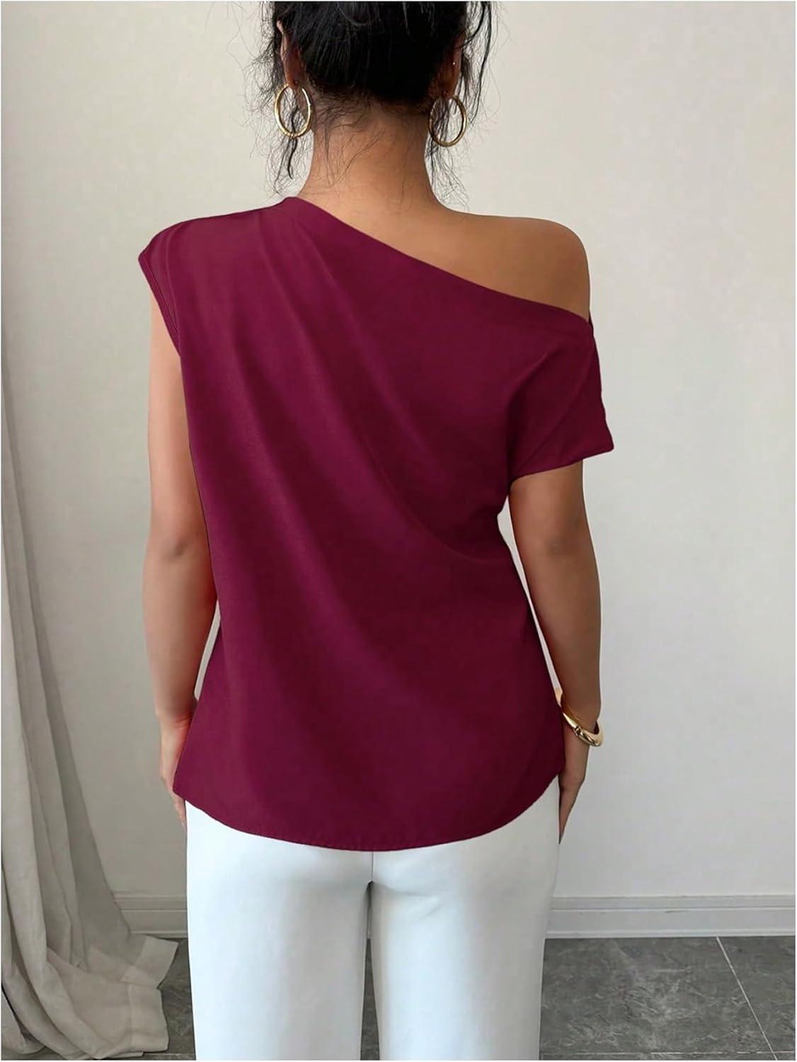 SOLY HUX Women’s Blouse Ruched Off The Shoulder Short Sleeve Asymmetric Neck Summer Tops(Plain Burgundy)