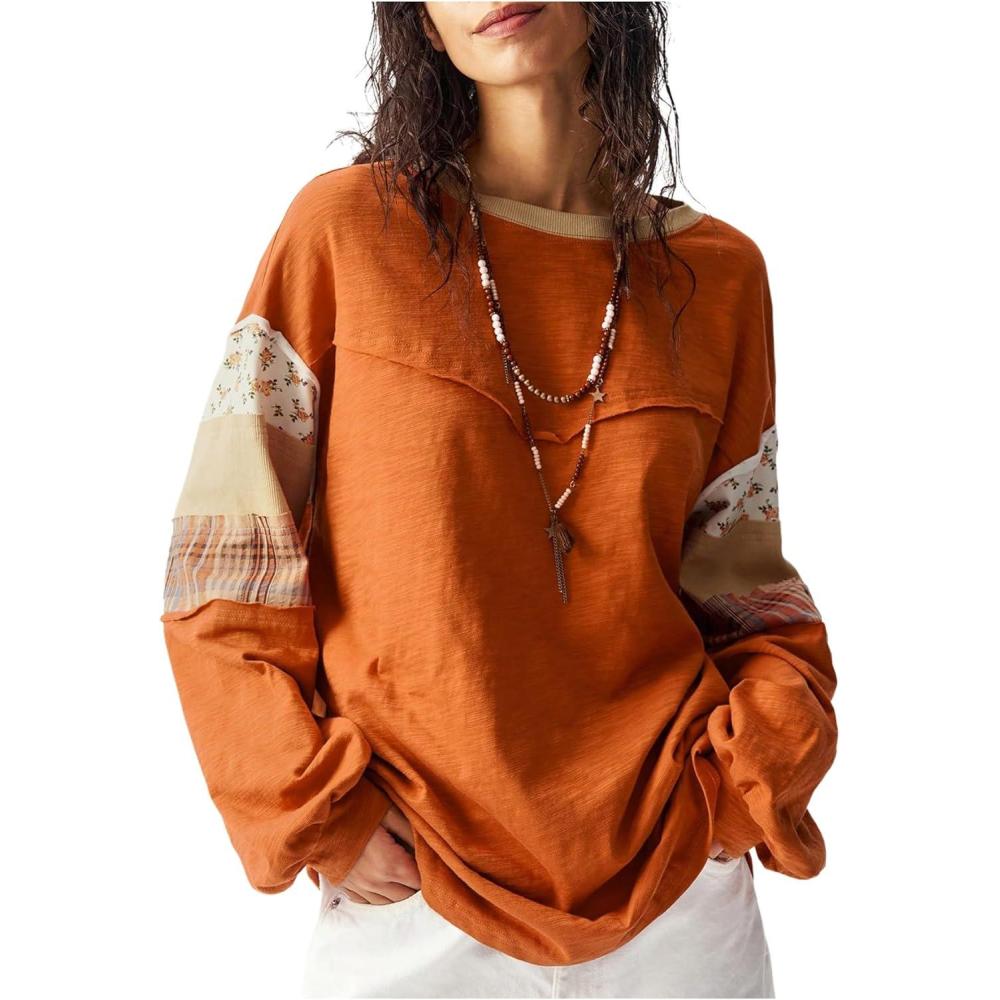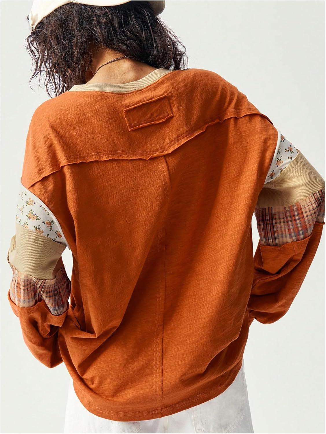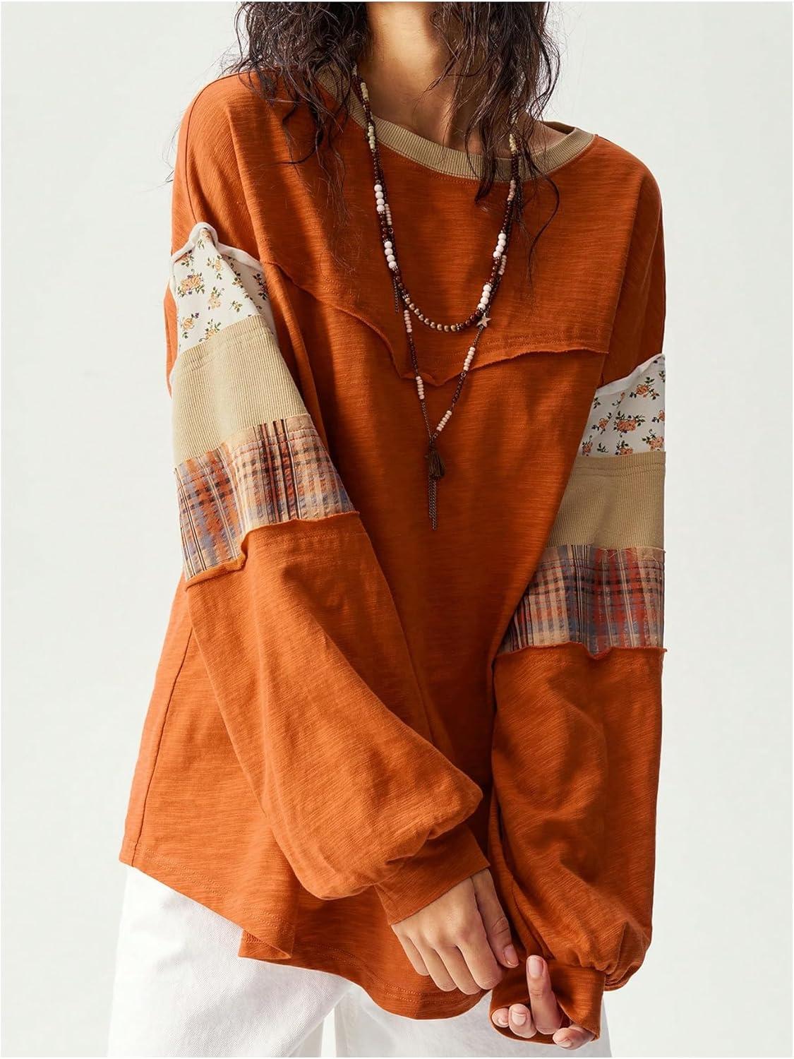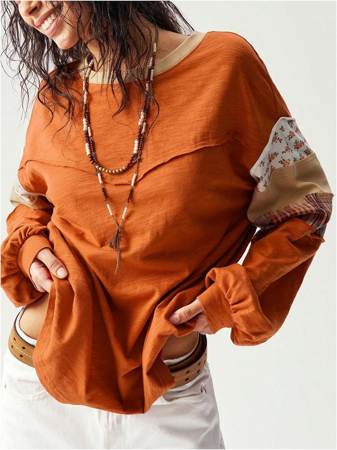 SOLY HUX Women’s Boho Floral T Shirt Crew Neck Long Sleeve Patched Tee Casual Loose Fit Tops(Red Floral)