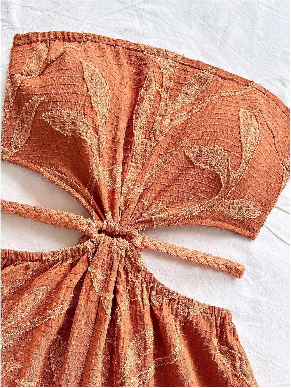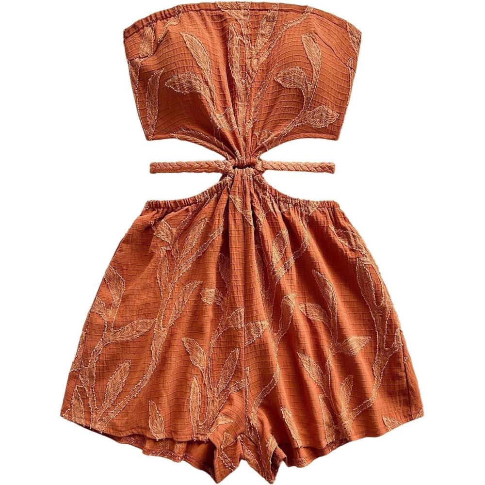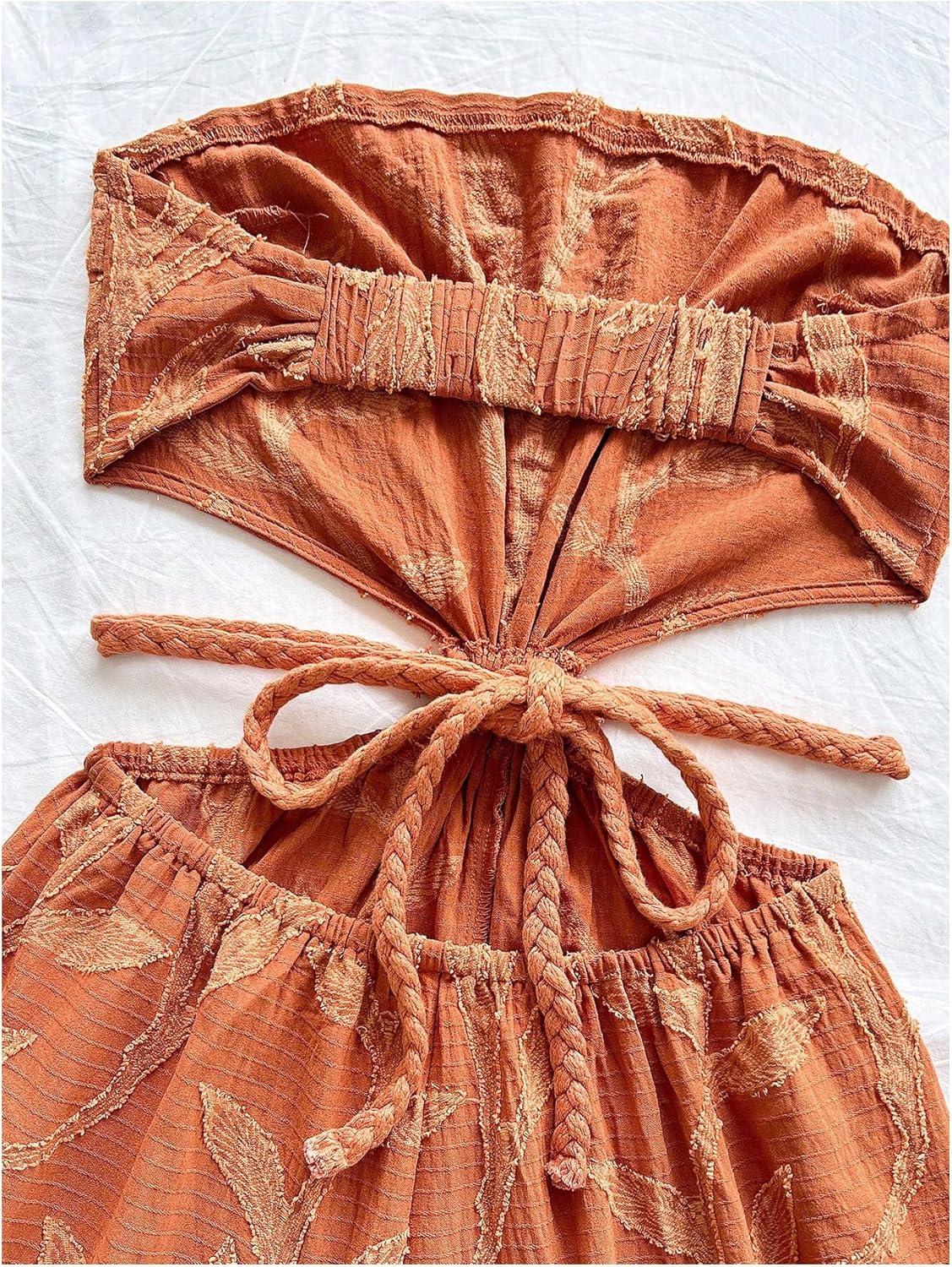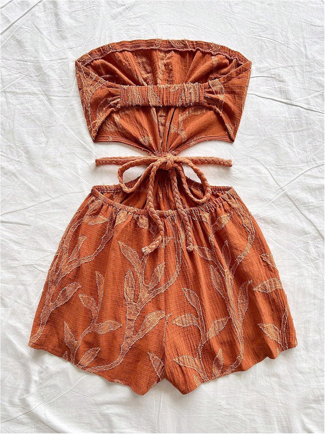 SOLY HUX Women’s Boho Tie Backless Tube Top Romper Strapless Cut Out Wide Leg Vacation Short Jumpsuits(Solid Brown)