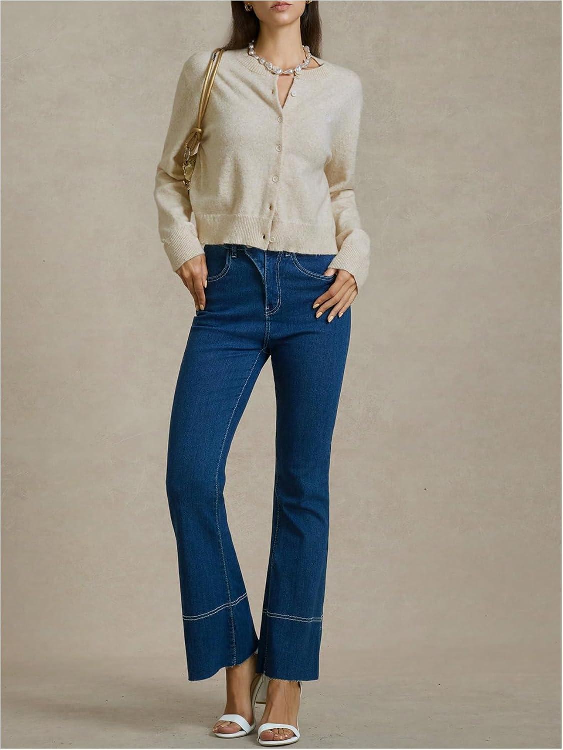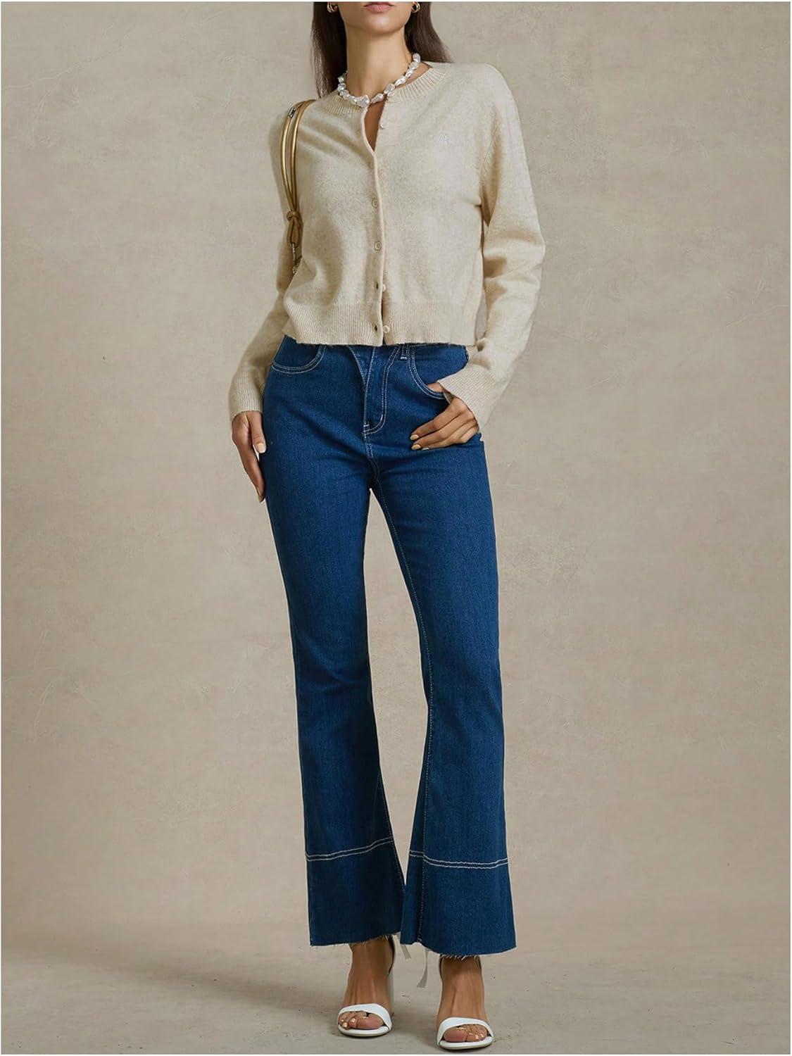 SOLY HUX Women’s Button Down Long Sleeve Crewneck Crop Cardigan Sweater Cute Knitwear Clothes(Solid Blue)