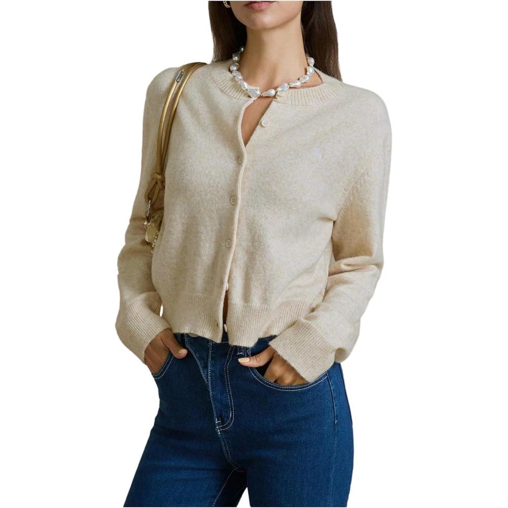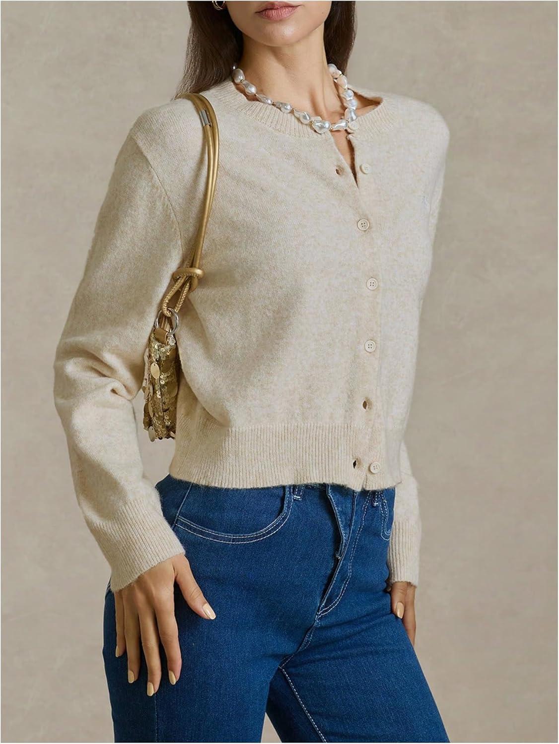 SOLY HUX Women’s Button Down Long Sleeve Crewneck Crop Cardigan Sweater Cute Knitwear Clothes(Solid Apricot)