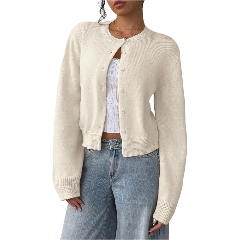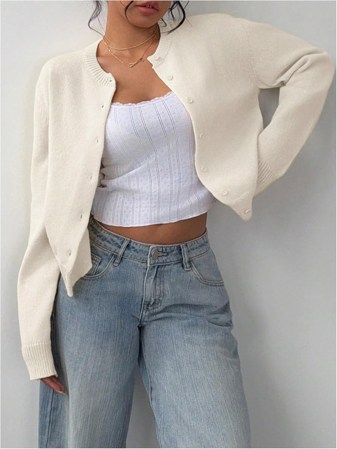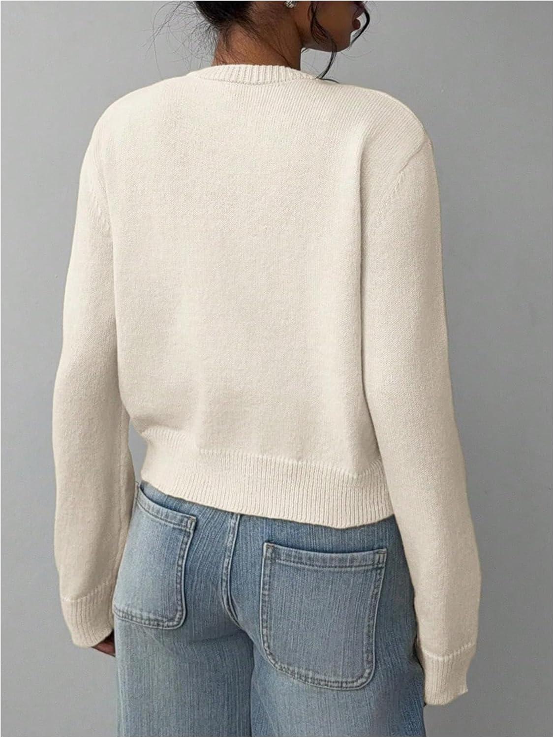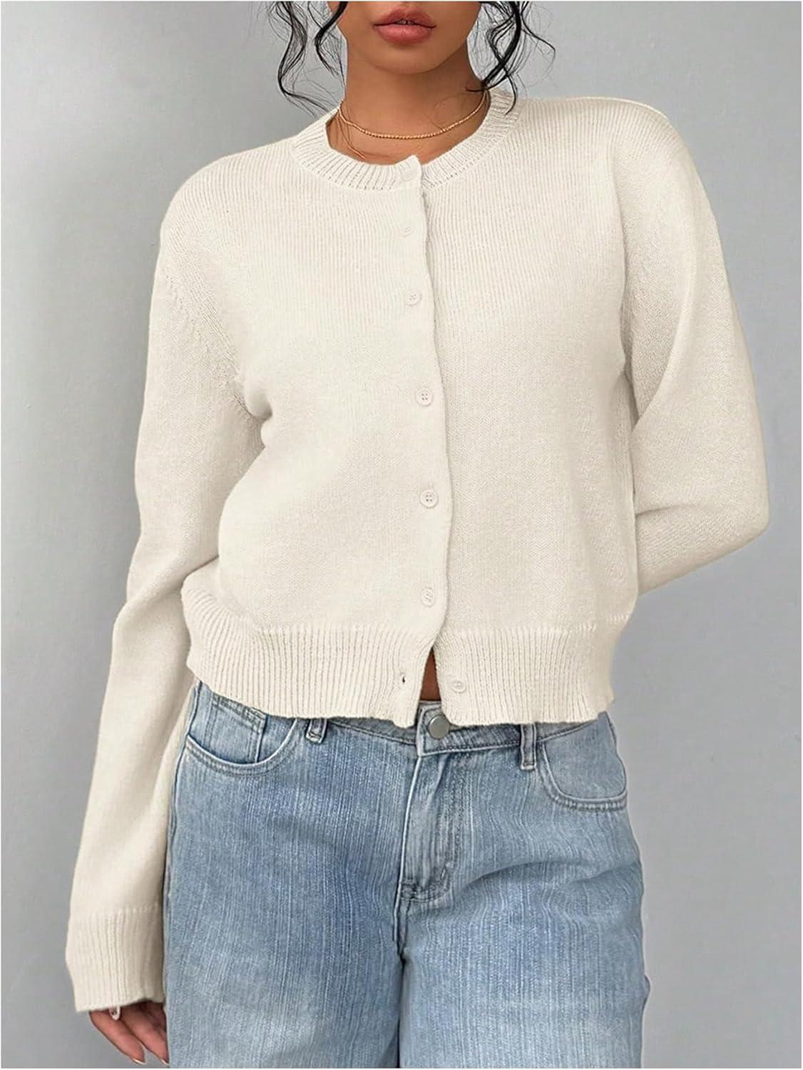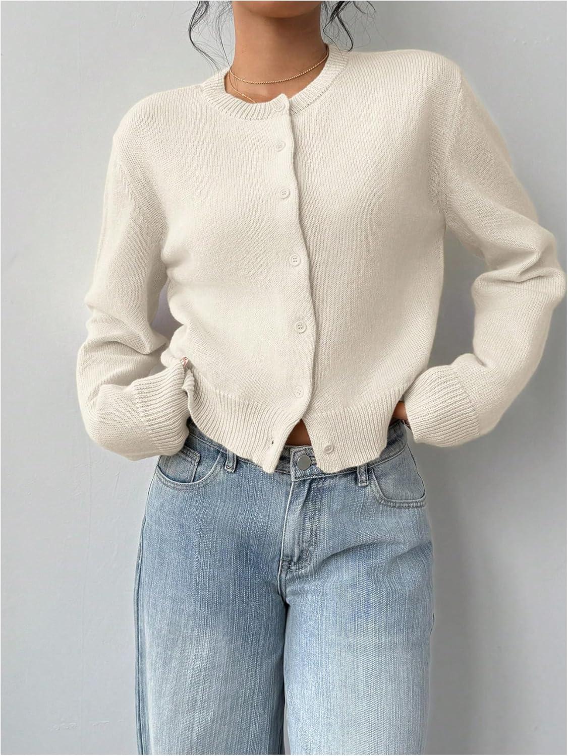 SOLY HUX Women’s Button Down Long Sleeve Crewneck Crop Cardigan Sweater Cute Knitwear Clothes(Solid Beige)
