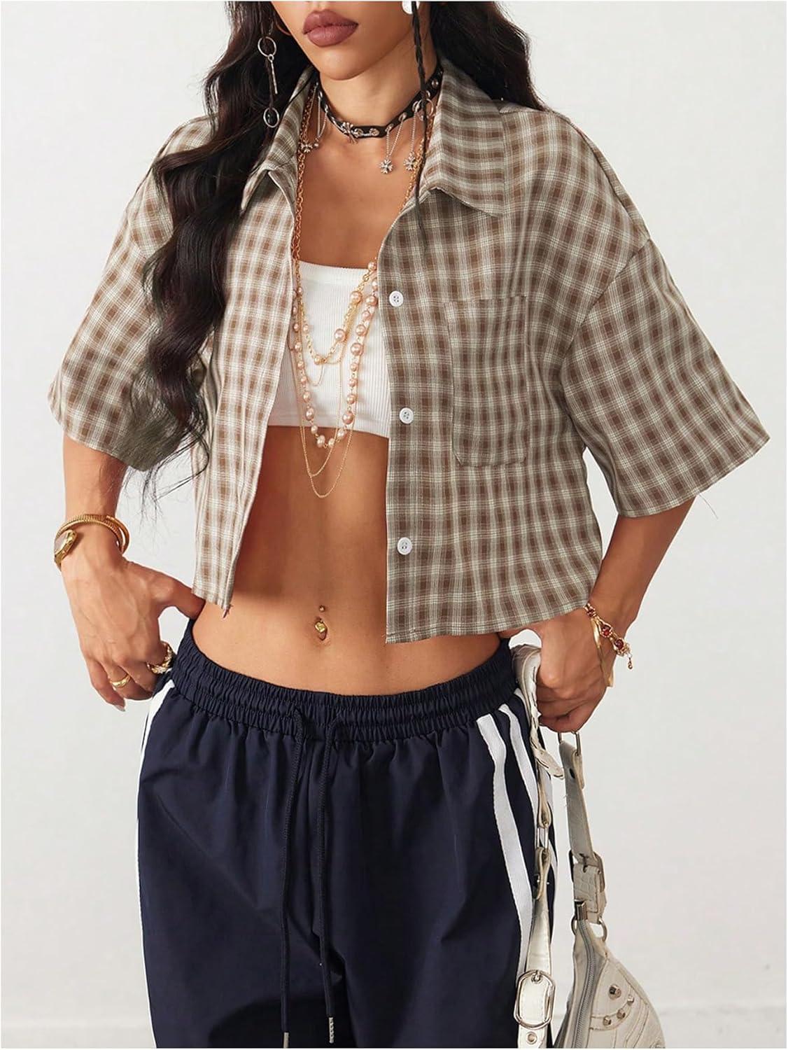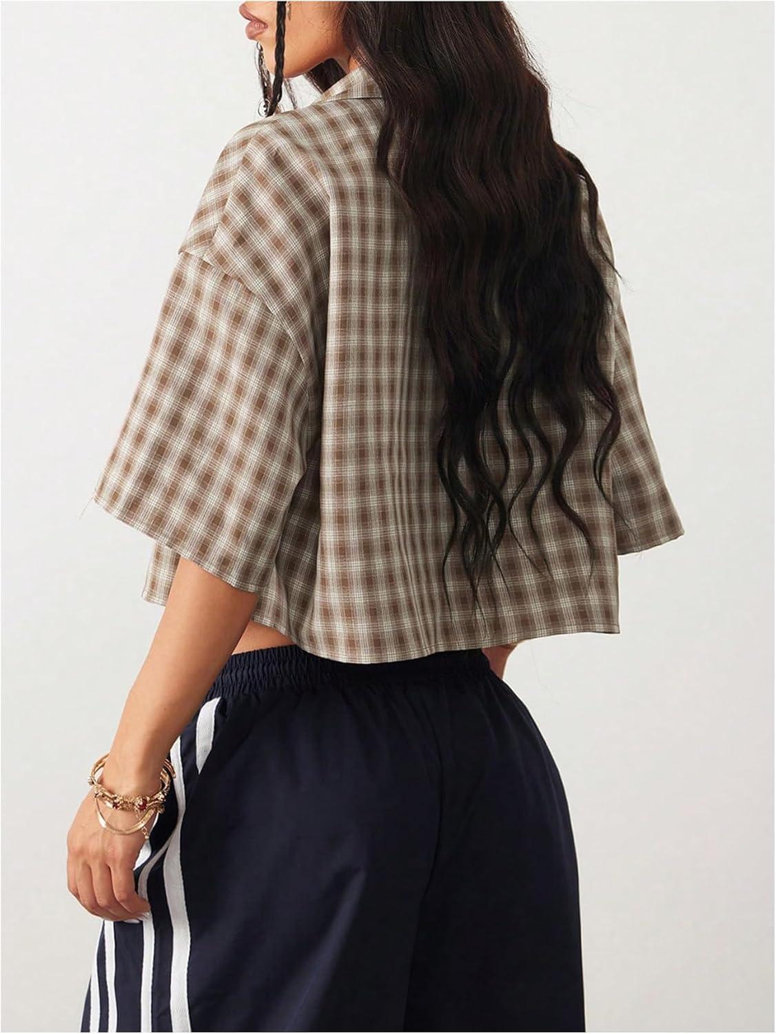 SOLY HUX Women’s Button Down Vintage Plaid Shirts Short Sleeve Crop Blouses Preppy Clothes(Rust Brown)
