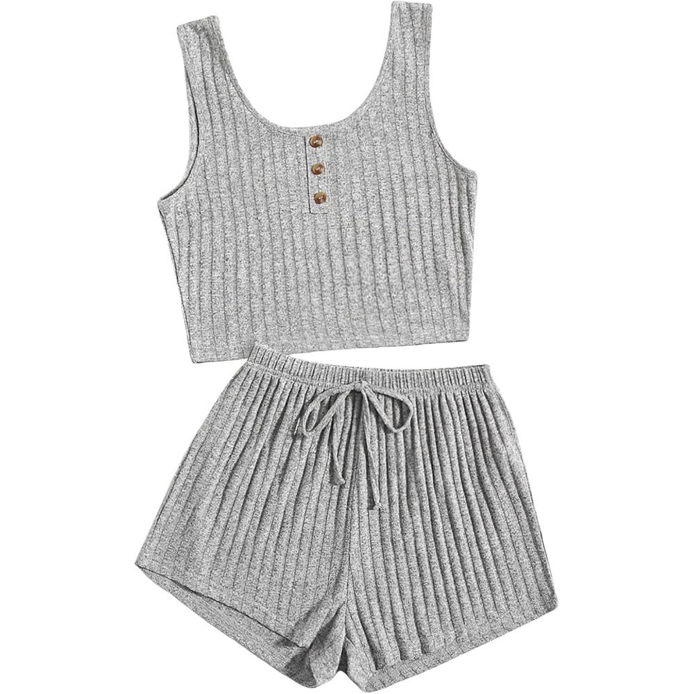 SOLY HUX Women’s Button Front Ribbed Knit Tank Top and Shorts Pajama Set Sleepwear Lounge Sets(Light Grey)