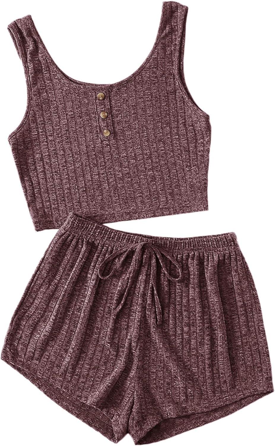 SOLY HUX Women’s Button Front Ribbed Knit Tank Top and Shorts Pajama Set Sleepwear Lounge Sets(Mauve Purple)