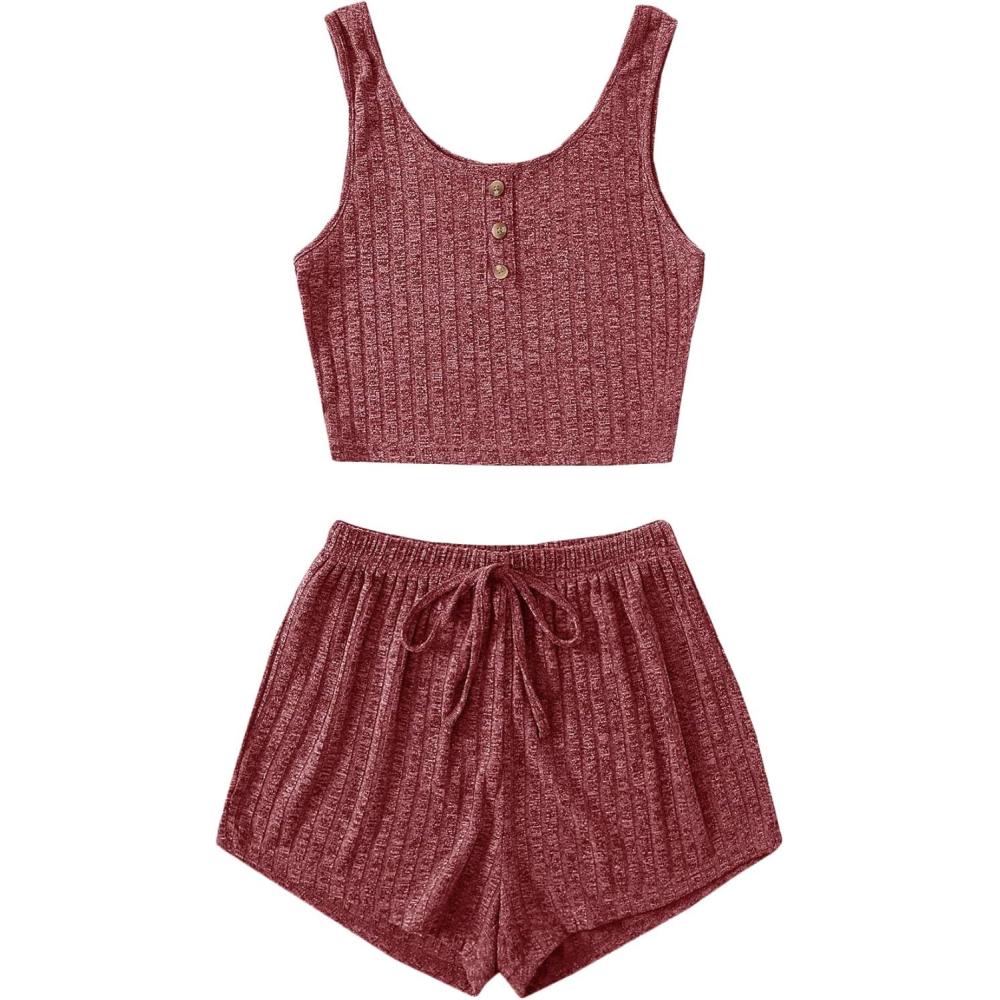 SOLY HUX Women’s Button Front Ribbed Knit Tank Top and Shorts Pajama Set Sleepwear Lounge Sets(Plain Red)