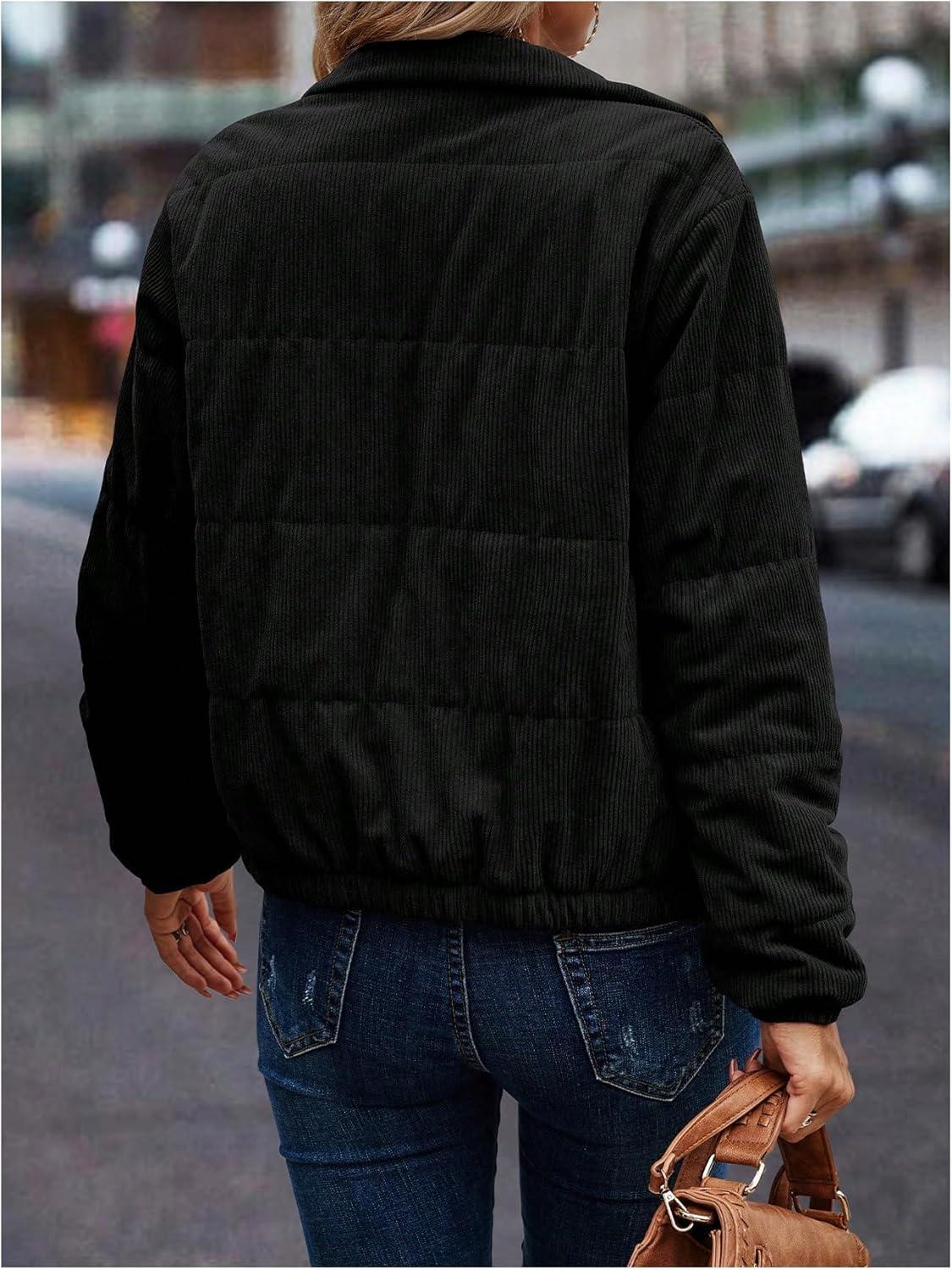 SOLY HUX Women’s Corduroy Quilted Puffer Jacket Zip Up Long Sleeve Padded Bomber Barn Jackets Coat with Pockets(Pure Black)