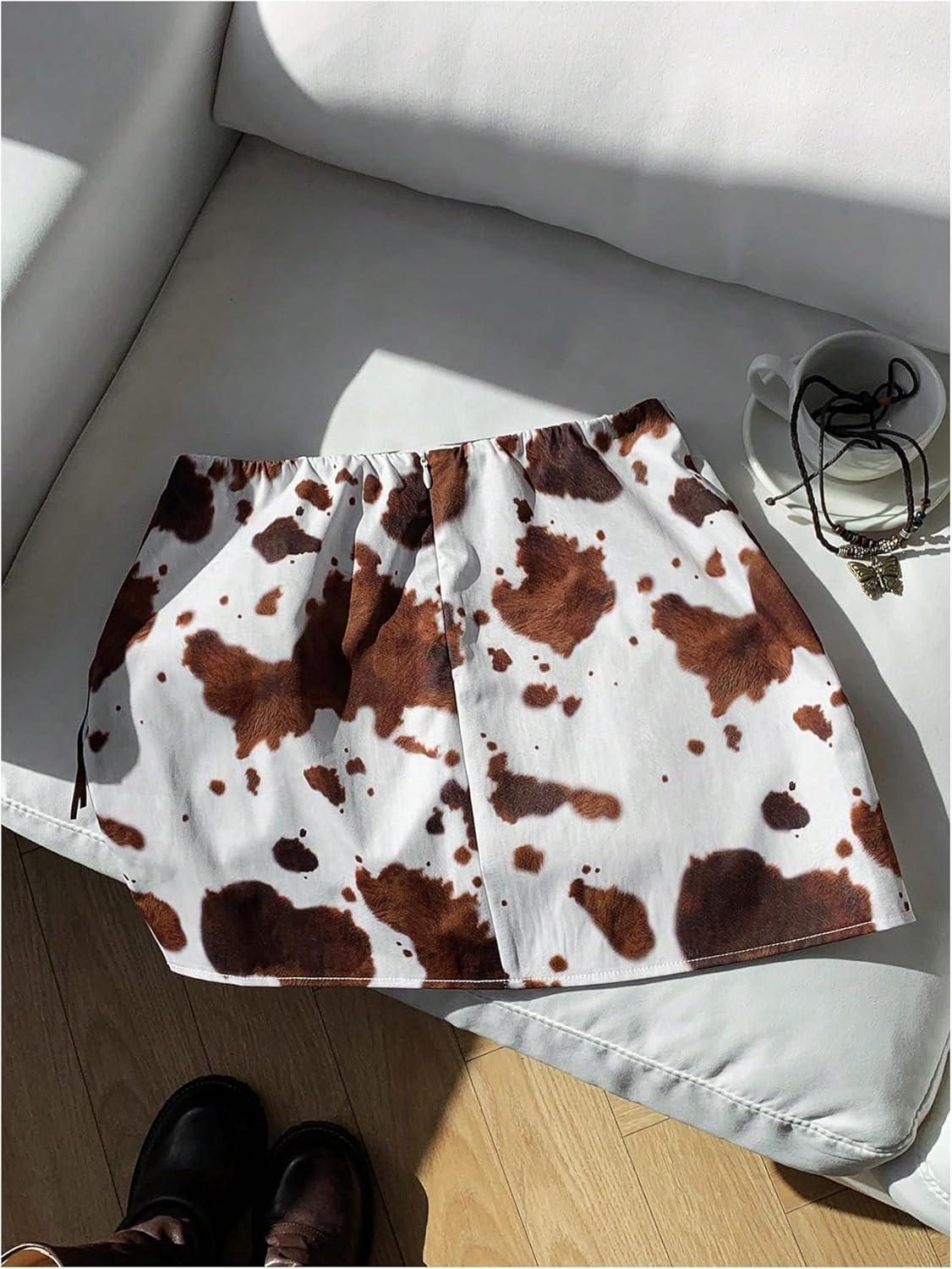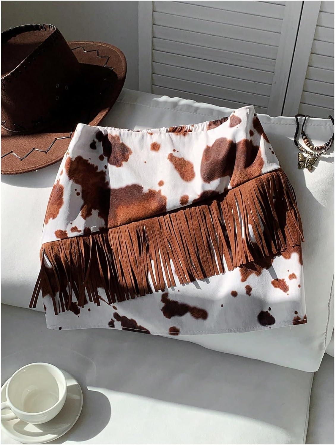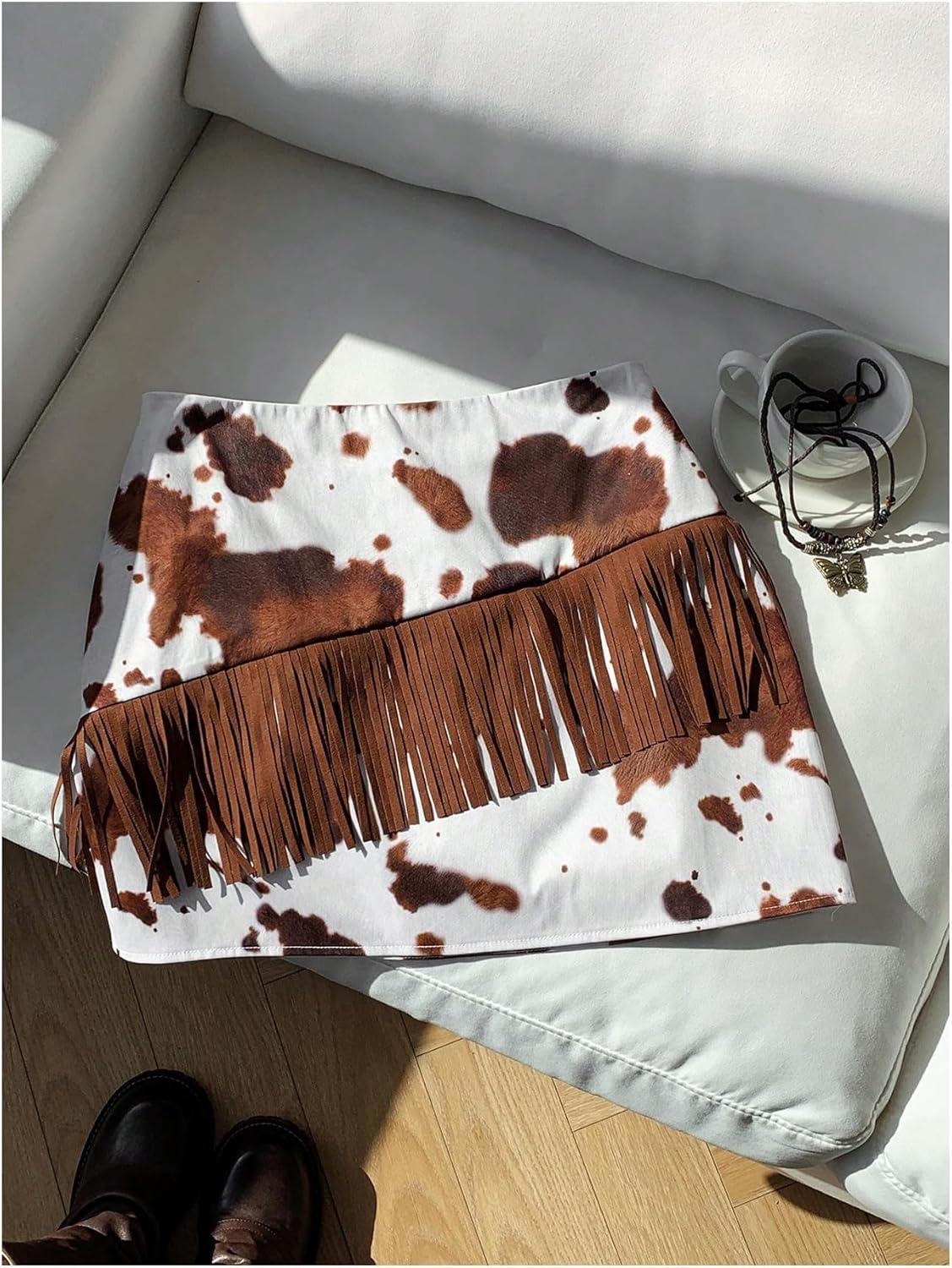SOLY HUX Women’s Cow Print Fringe Mini Skirt Summer Going Out Skirts Western Country Concert Outfit(Rust Brown Cow)