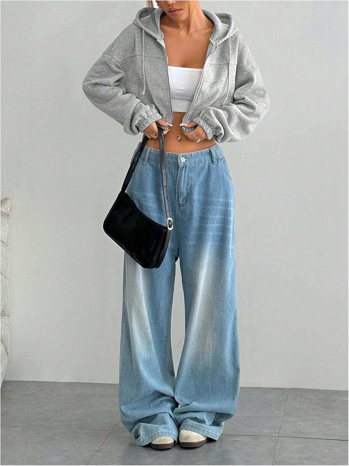 SOLY HUX Women’s Cropped Zip Up Hoodie Y2k Drawstring Drop Shoulder Sweatshirts Streetwear(Plain Grey)