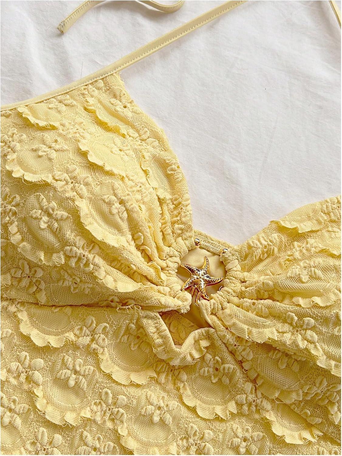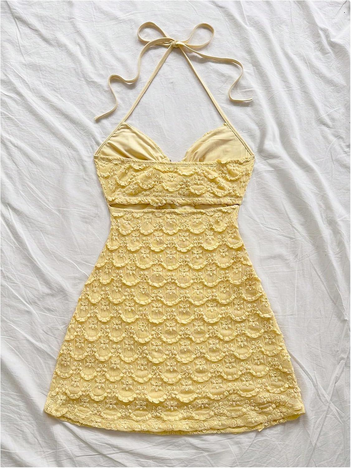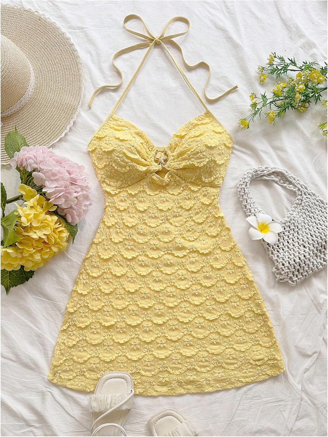 SOLY HUX Women’s Cut Out Tie Backless Halter Dress Sleeveless Mini Beach Vacation Dresses(Plain Yellow)