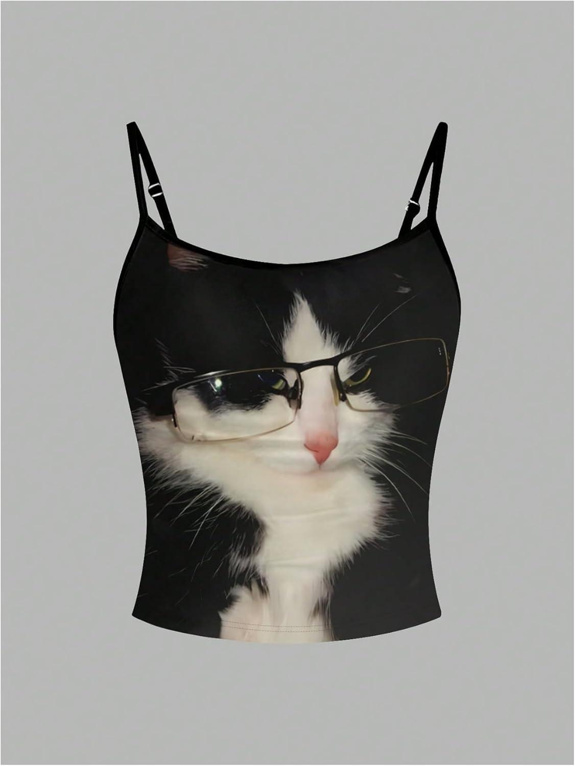 SOLY HUX Women’s Cute Graphic Cami Tops Cat Print Spaghetti Strap Summer Crop Tops Camisole(Black Cat)