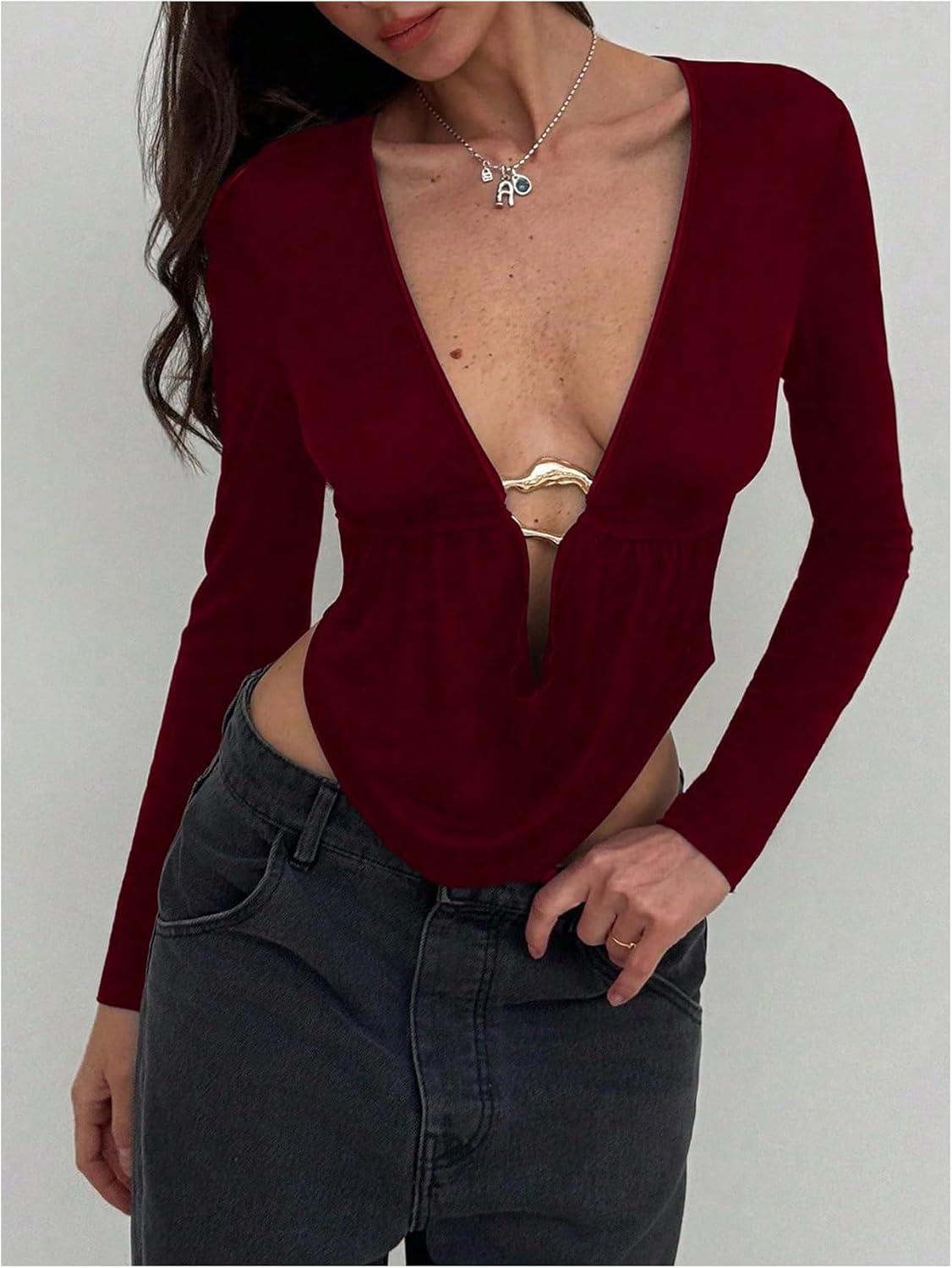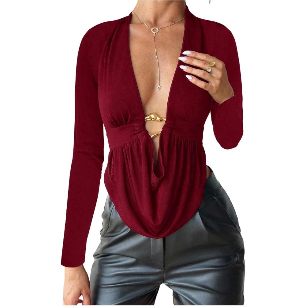 SOLY HUX Women’s Deep V Neck T Shirt Long Sleeve Metal Decor Draped Front Ruched Asymmetrical Tops(Pure Burgundy)