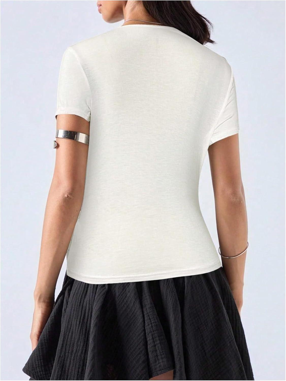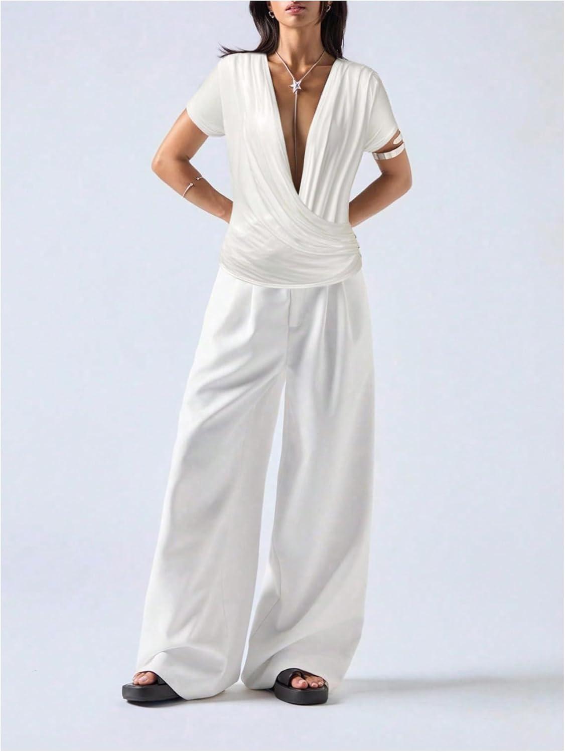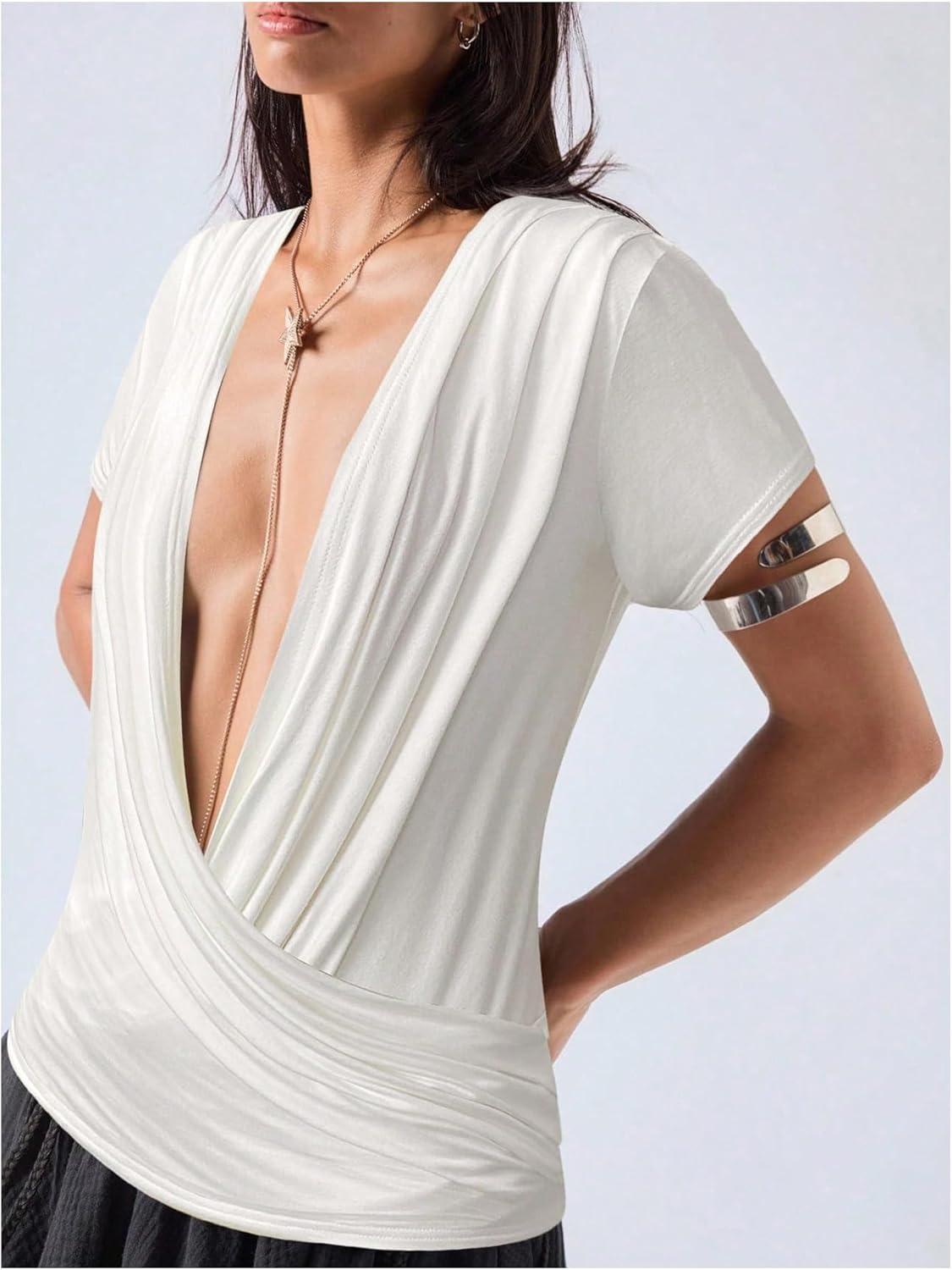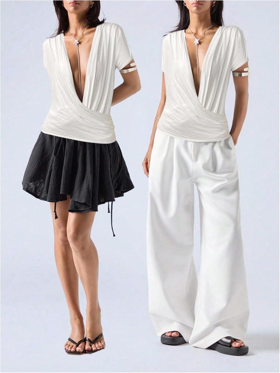 SOLY HUX Women’s Deep V Neck T Shirts Short Sleeve Draped Fitted Sexy Tops Summer Date Night Outfit(Plain White)