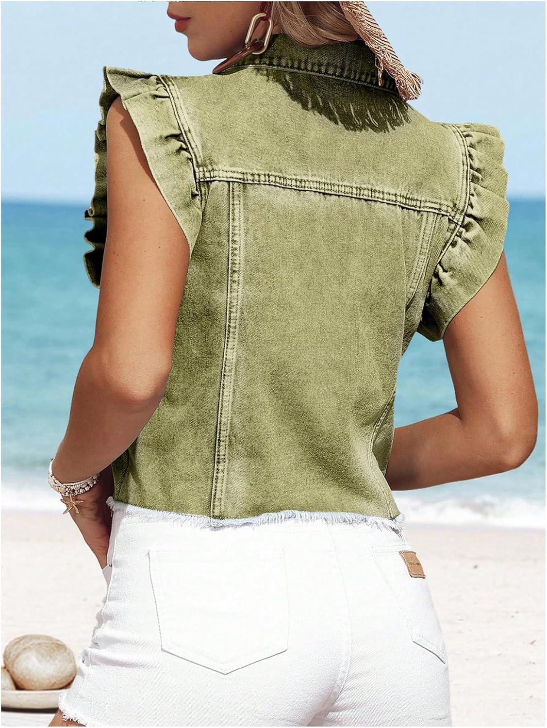 SOLY HUX Women’s Denim Jacket Ruffle Cap Sleeve Button Down Trendy Crop Jean Jackets Coat(Plain Green)