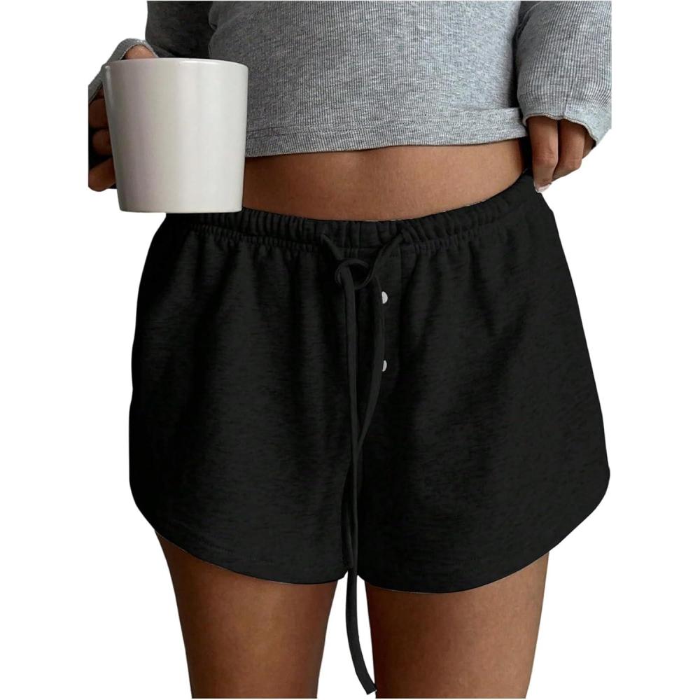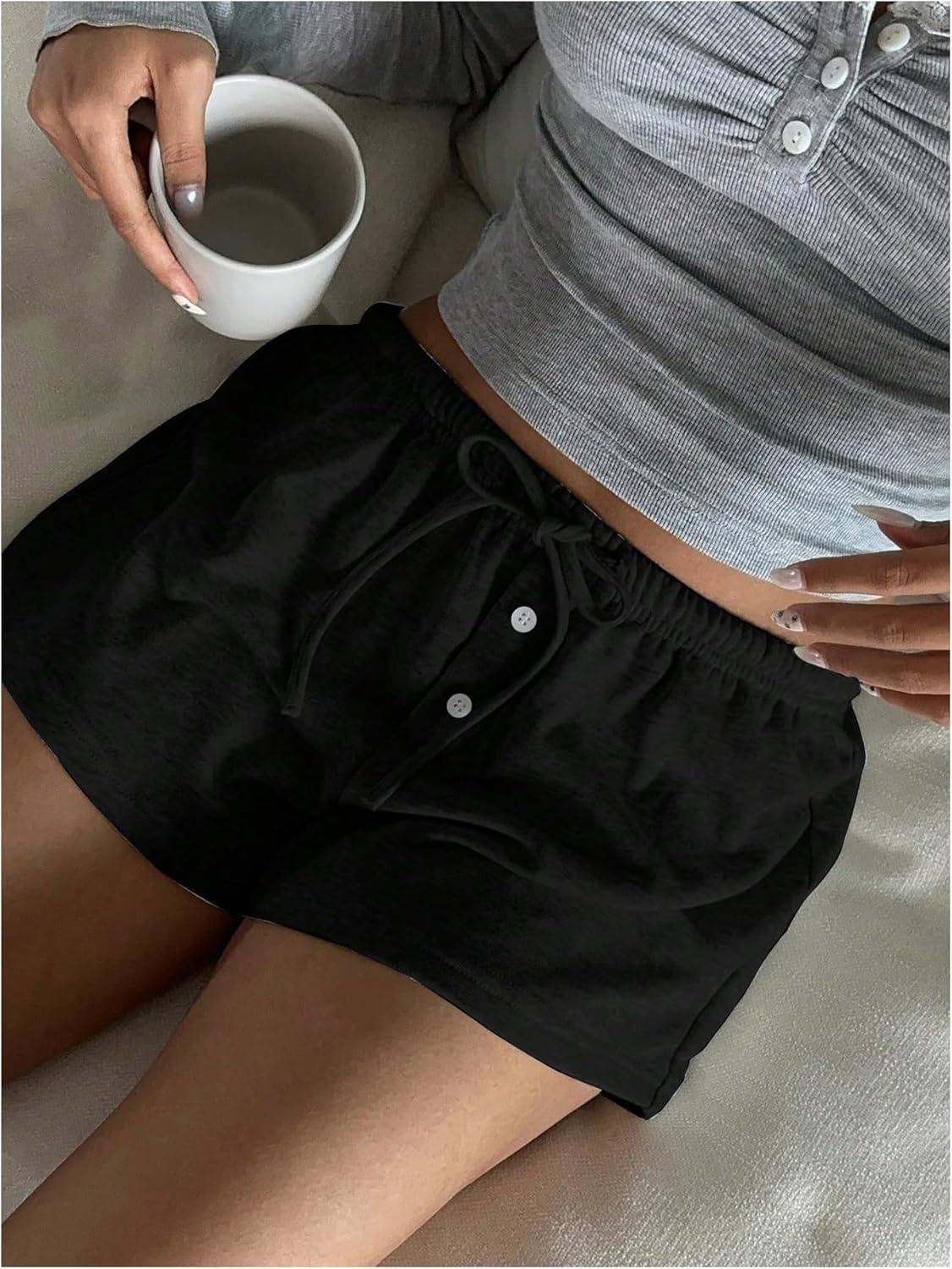 SOLY HUX Women’s Drawstring Waist Shorts Button Elastic Low Rise Casual Summer Shorts(Plain Black)