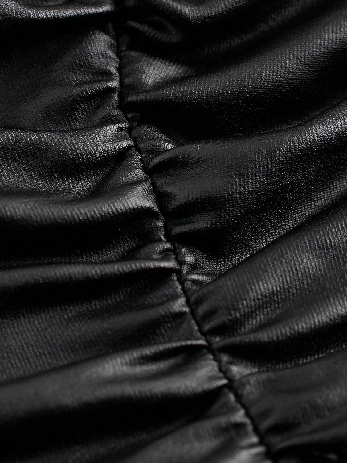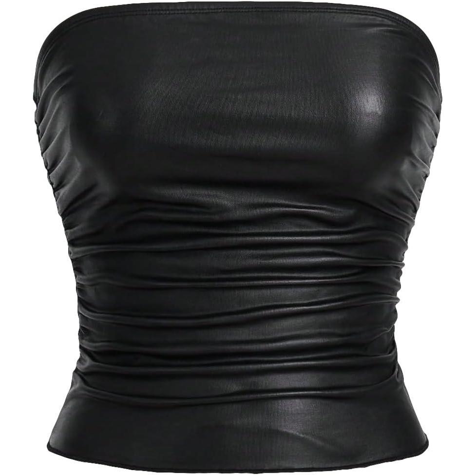 SOLY HUX Women’s Faux Leather Strapless Crop Tube Tops Going Out Bandeau Shirts Rave Concert Outfit(Solid Black)