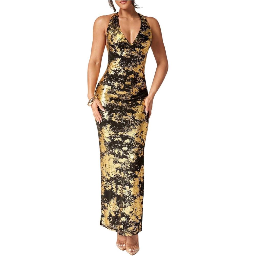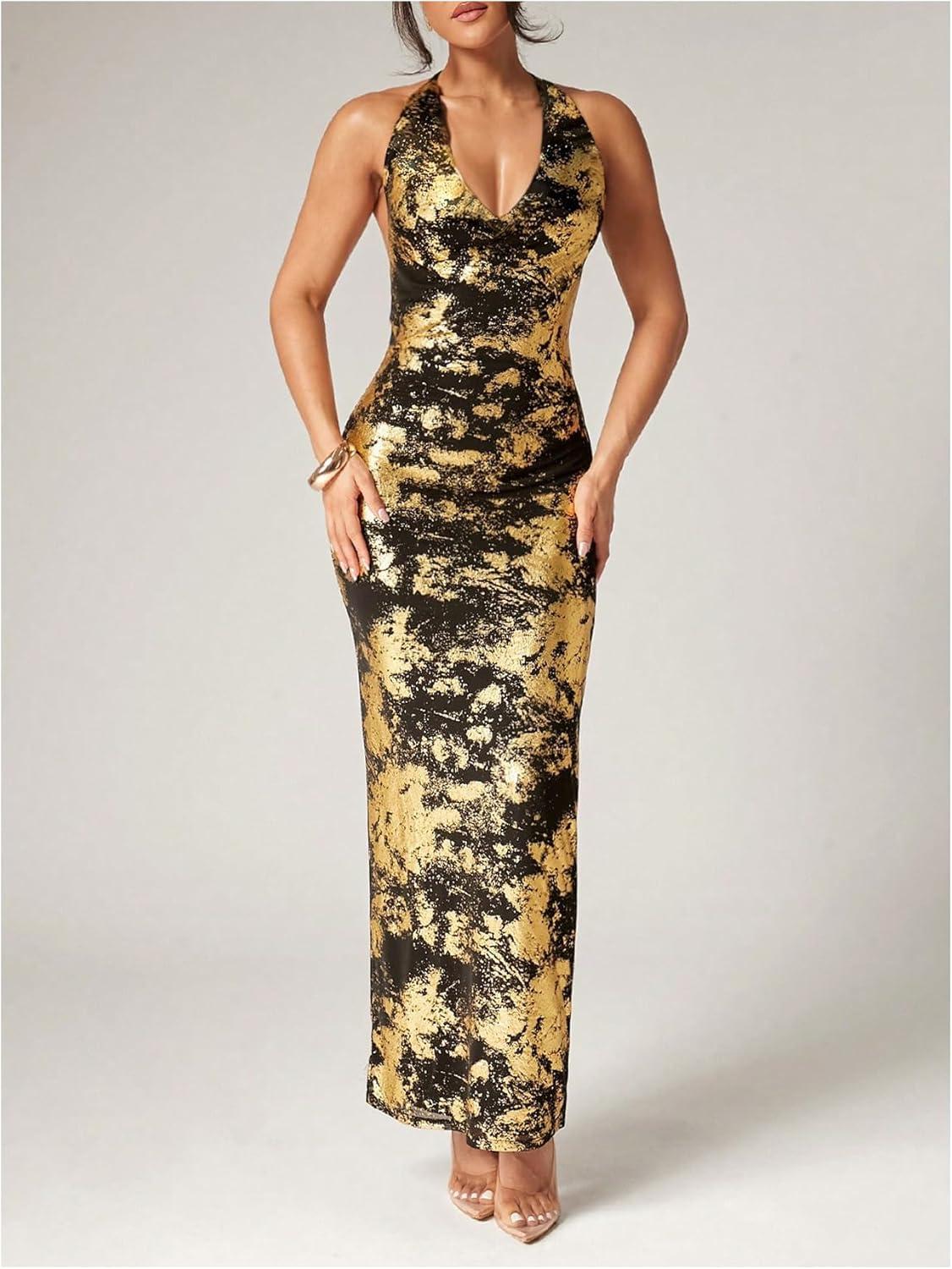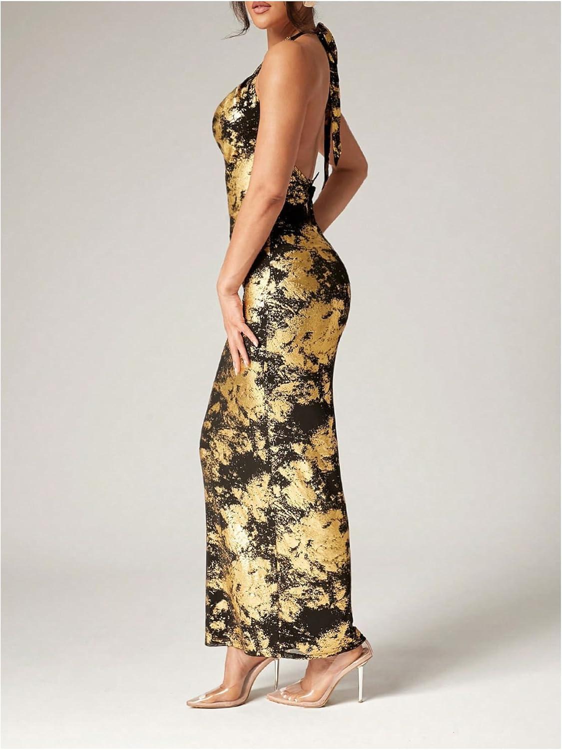 SOLY HUX Women’s Floral Halter Maxi Dress Draped Cowl Neck Backless Bodycon Wedding Guest Party Mesh Cocktail Long Dresses(Multicoloured)