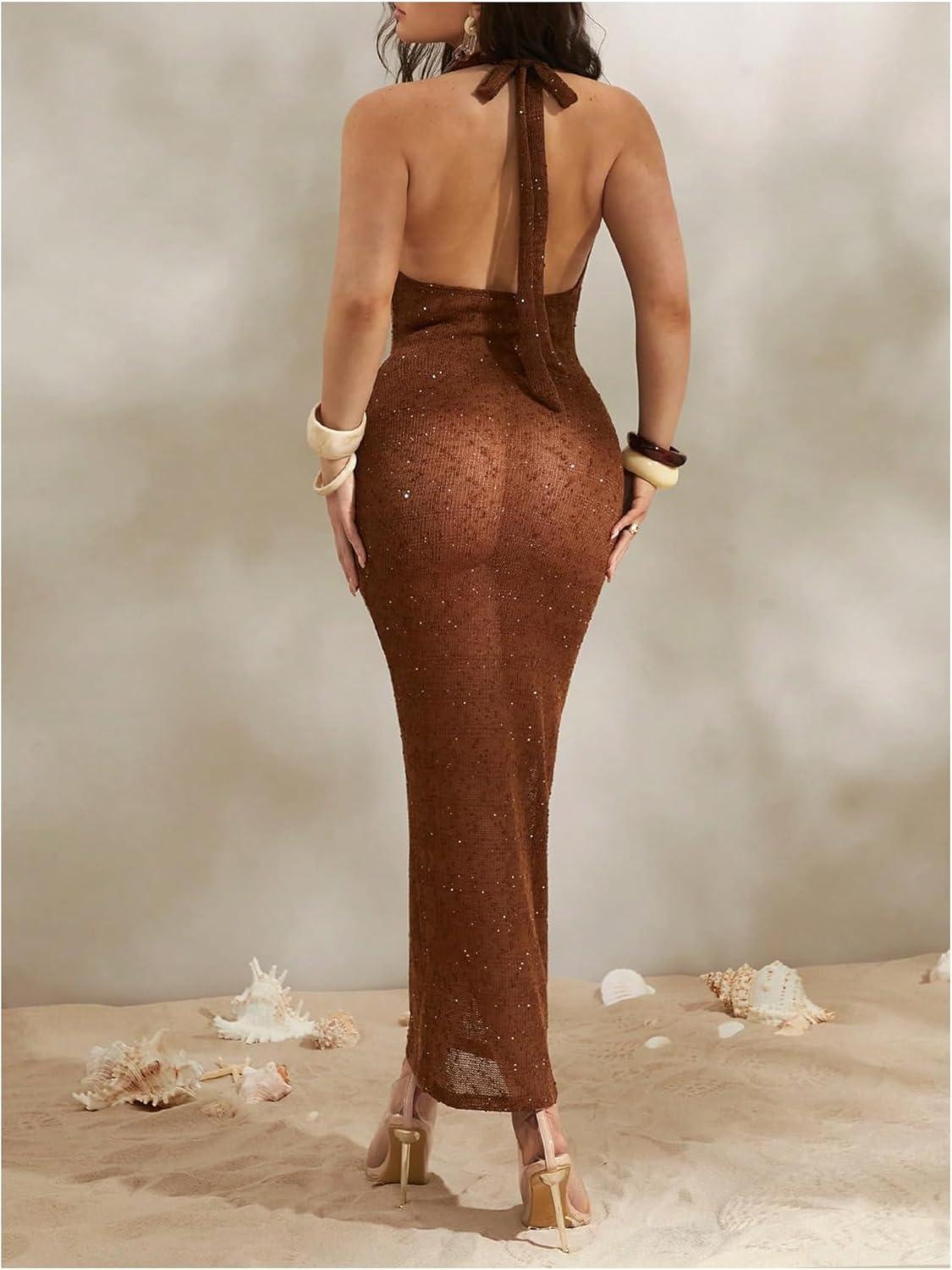 SOLY HUX Women’s Floral Halter Maxi Dress Draped Cowl Neck Backless Bodycon Wedding Guest Party Mesh Cocktail Long Dresses(Plain Brown)