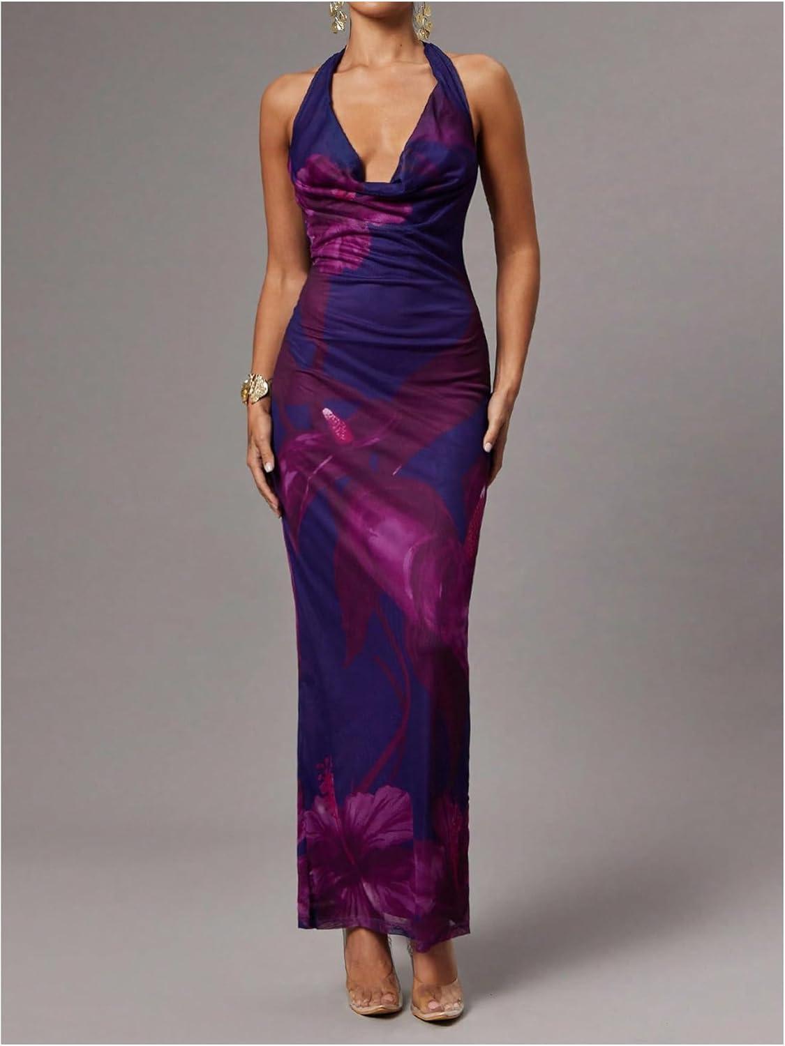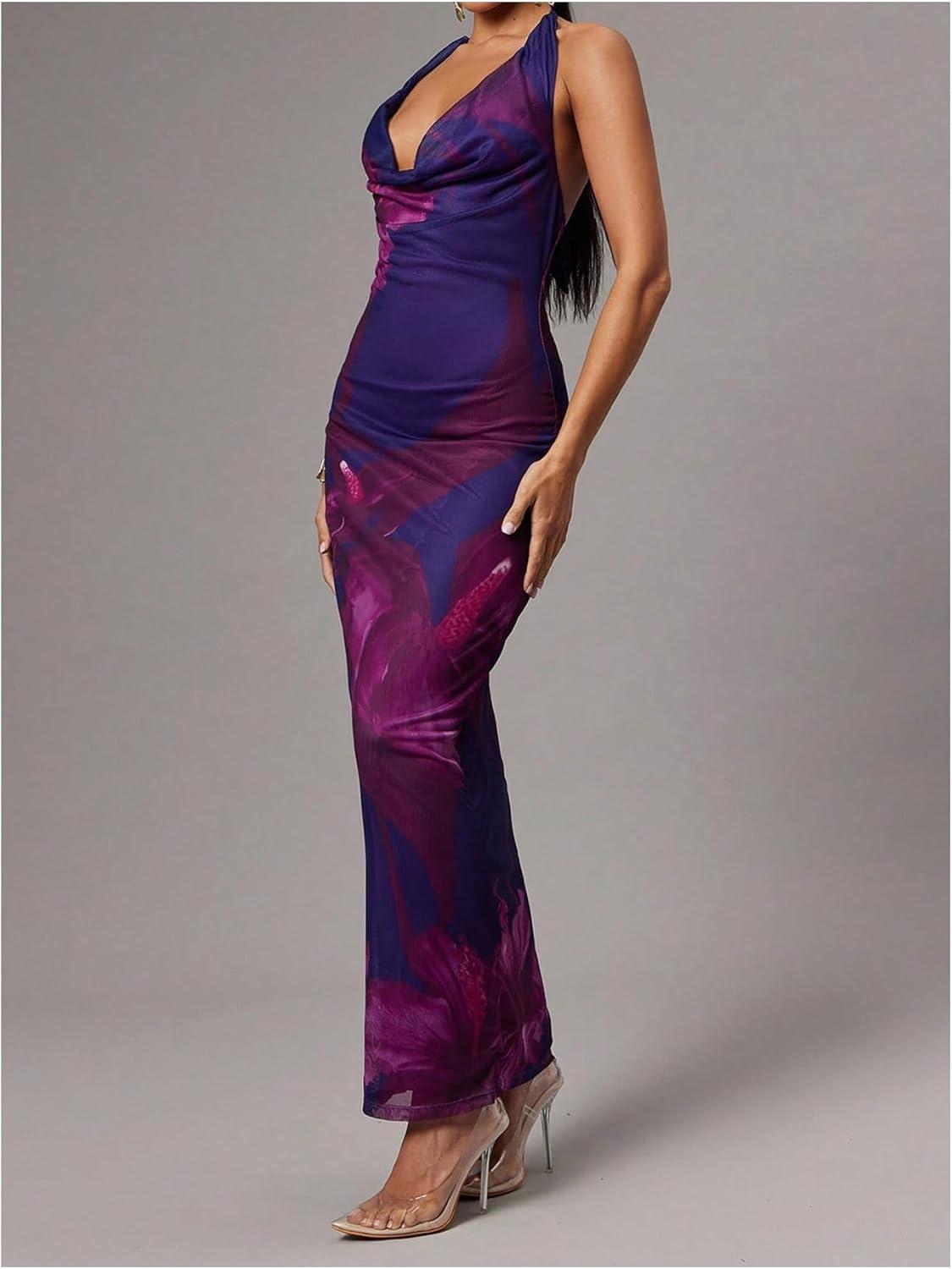 SOLY HUX Women’s Floral Halter Maxi Dress Draped Cowl Neck Backless Bodycon Wedding Guest Party Mesh Cocktail Long Dresses(Purple Floral)