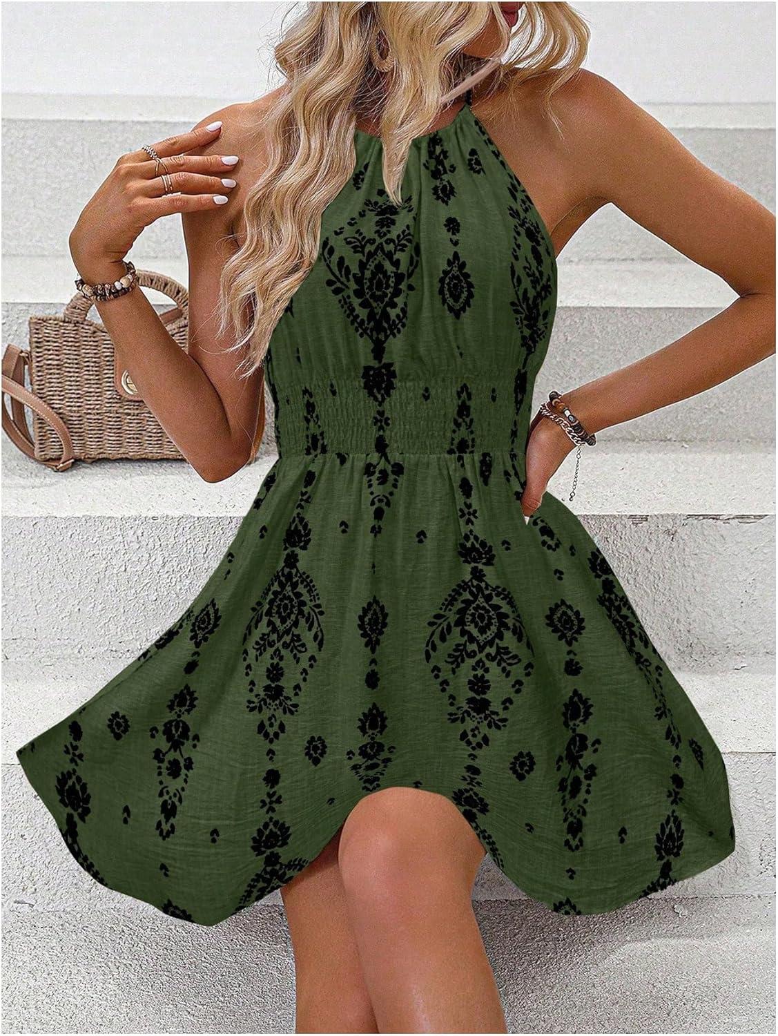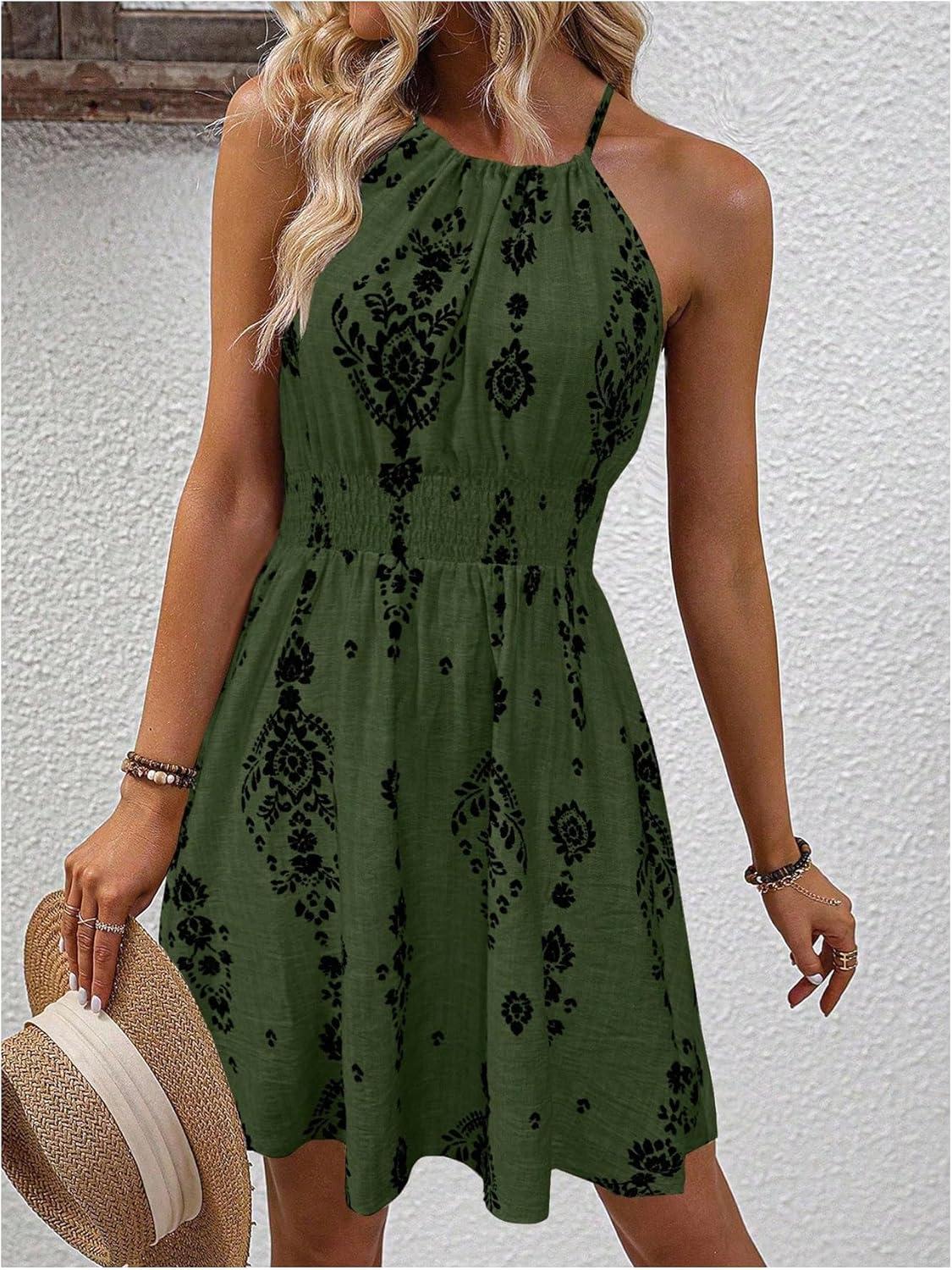 SOLY HUX Women’s Floral Halter Mini Dress Boho Sleeveless Flowy Beach Vacation Sundress(Army Green Printed)