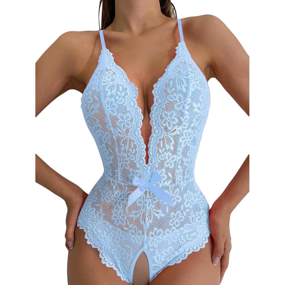 SOLY HUX Women’s Floral Lace Scalloped Trim Criss Cross Back Lingerie Teddy Bodysuit(Plain Light Blue)