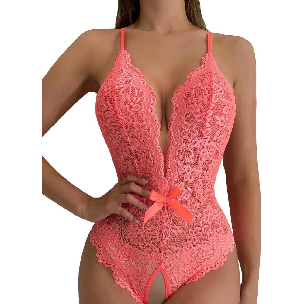 SOLY HUX Women’s Floral Lace Scalloped Trim Criss Cross Back Lingerie Teddy Bodysuit(Pure Watermelon Pink)