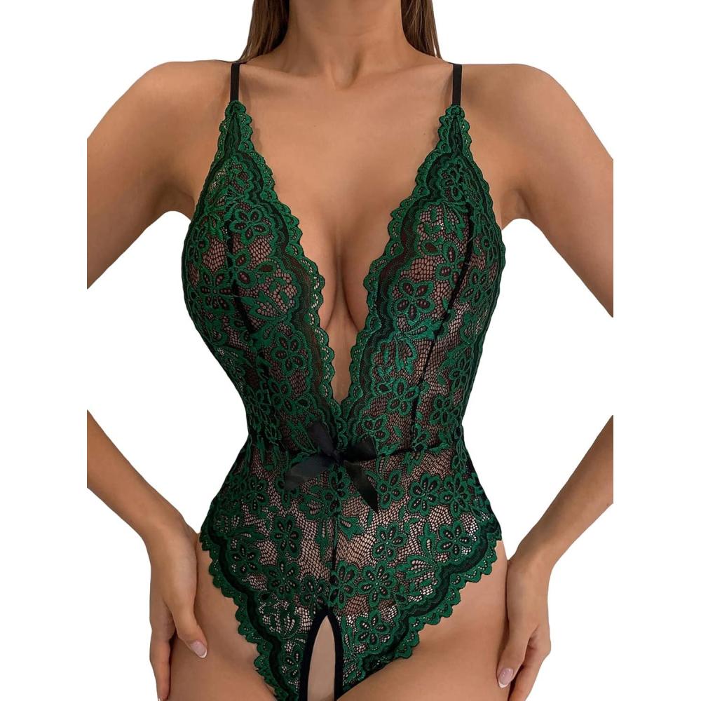 SOLY HUX Women’s Floral Lace Scalloped Trim Criss Cross Back Lingerie Teddy Bodysuit(Solid Dark Green)